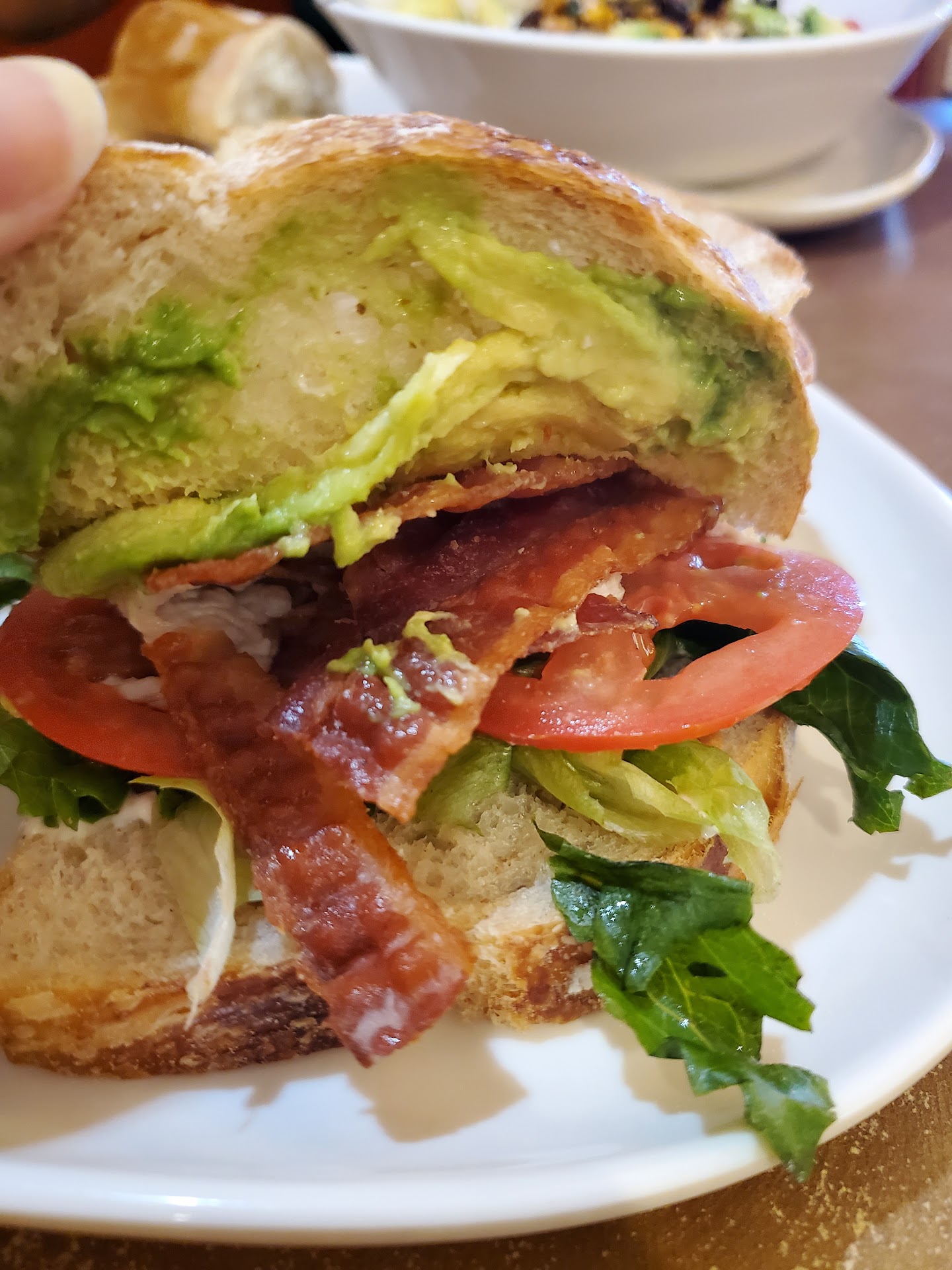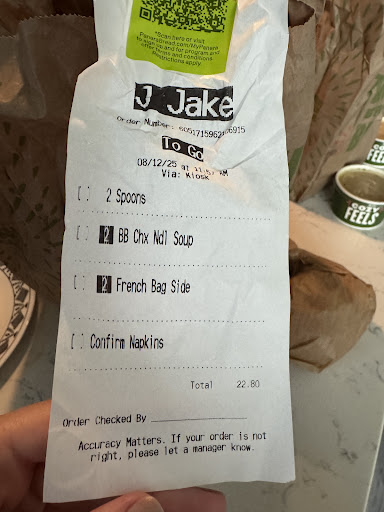 Read moreWe didn't have a good meal here. My mom ordered the pick two deal, Smokehouse BBQ chicken sandwich with the Turkey Chili soup. I also got pick two with the Chicken Frontega Sandwich and the BBQ chicken salad. My mom didn't want anything with milk in it for health-reasons and when she got the sandwich, there was barely any chicken. She said there was just ¼ a cup of chicken for ½ of the BBQ chicken sandwich. Not worth the price; the amount of chicken she got should've been priced at 4-5 dollars instead. The guy we got the food from gave her chips instead and said that the turkey chili soup definitely has milk in it but in the kiosk, we wanted to exclude milk from the soup and it didn't stop us from ordering the turkey chili soup. What? My mom also got the the hazelnut coffee from the self-serving station and it wasn't hot plus it had a weird aftertaste. I tasted it too and agreed with her. For my ½ Frontega Chicken Sandwich, it didn't even have any basil. Not enough chicken, not enough cheese. For my salad, it was good. It tasted fine and I liked the sauce and crunchy little chips. My mother just came out from urgent care and she was in pain and I didn't care about the missing basil because of how hungry I was. My mother and I won't be coming back. I also got hot chocolate and it was too sweet. Don't get extra whipped cream and caramel...