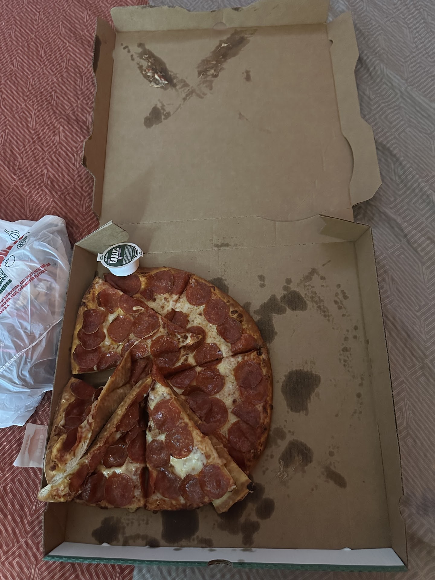Read moreI usually always order from papa johns and get pretty good service... However, this is the second time I've ordered pizza from here and got crappy pizza. I'm a vegetarian and ordered mushroom, olive, and bananas pepper pizza. All was well, until I bit into a piece and it had ham in it. After checking the pizza, multiple pieces had meat on it. Okay, strike one. I didn't order from papa johns for a while. I ordered from here again and they forgot half of my order. The guy told me it was in his car, he would be right back... Thirty minutes later he comes back with the rest of my cold order. The food was good, so I don't count this as a bad pizza... But, strike two. Tonight, I received my pizza 45 minutes after I ordered it and it looks like the driver dropped it or turned too hard. I don't usually give bad reviews, but I think this place deserves it. I honestly do believe that it is JUST this papa johns though so I'll probably try to change the place my pizza comes from in the app because this is definitely...