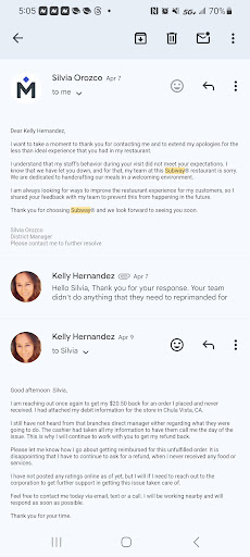 I have to take the time to report my extreme disappointment with this location and their district manager, Silvia. I placed an order on their online order platform via Google maps on the 5th of April. I ordered a meal for $20.50. This stores number is 53987, and it shows on my receipt. I went in to pick up my order, and the cashier stated they didn't have one in their system. I showed him my online receipt, and he said it was a separate location. By this time, I needed to head to work as I was working next door at another retail location. Placed the order here for its convenience. Frustrated, I left and decided that when it was my lunch time at work, I'd go to the separate facility about 3 miles away. When I arrived thier the cashier was friendly and helped me figure out what the location was and confirmed that it was the location, I initially thought it was right next to work. I returned to this location once again, and now my lunch break is near over. Stated it was confirmed that this is the correct location. He again couldn't do anything. Wouldn't refund the amount paid, nor would build the sandwich I ordered. I asked for the manager of the day but nobody was there. He stated he would give my number to them and have them call me. I said I'd follow up as well. No leader of this establishment ever reached out. Only when I submitted an online message to Subway did I get a generic response that the district manager would talk to the team about my negative experience. She never offered to refund me or give an option to take care of the meal I paid for and never got. I responded twice after asking for help in getting something resolved. She has not responded as of today over 2 weeks later. I hope someone will reach out to me now to help get my refund for this horrible experience. I gave alot of opportunity for the store to right this wrong, but they decided to ignore it and hope I just would go away. I can't let that happen as I am not going to pay for something I never got. Please see the attached emails that show the lack of genuine concern for...