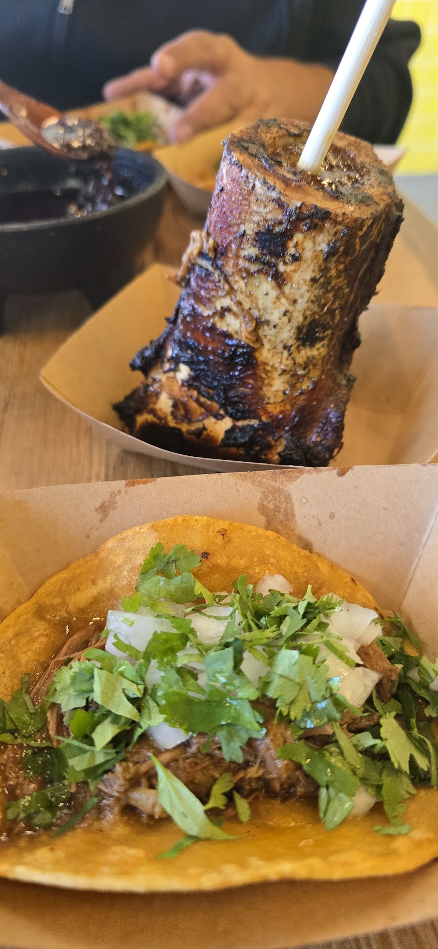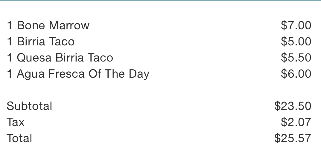 They are just getting under way. They offer inside and outside seating. On the menu, you can also get frijoles de la olla, birria tortas, and bone marrow. Oh yes, they make natural aguas, such as lemon cucumber mint, jamaica, horchata coconut, de olla horchata with coffee.