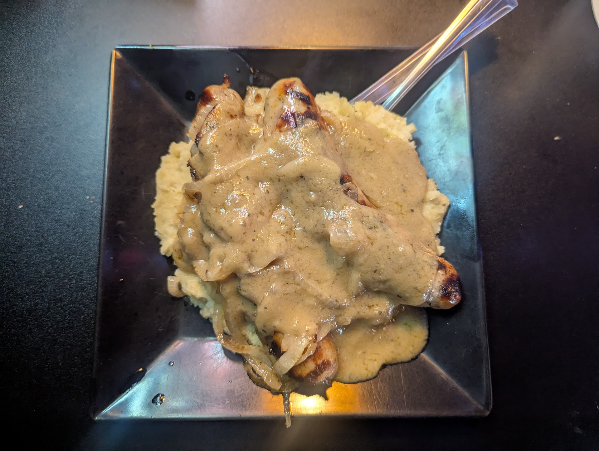 One of the things I love about their happy hour is the $5 margaritas with different flavor options—classic, mango, and even a spicy jalapeño version. For food, I ordered the chicken sliders, which were solid, and the bratwurst, which came with Dijon mustard. While the brat itself was good, it felt a bit plain—some grilled onions or another topping would’ve added more character.