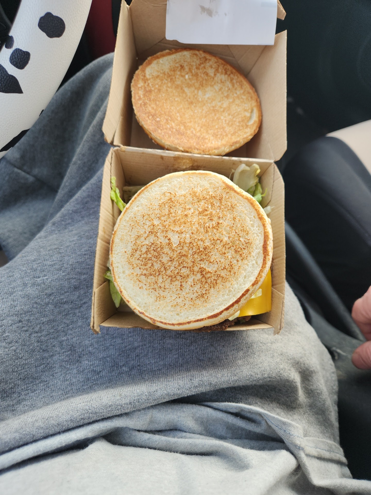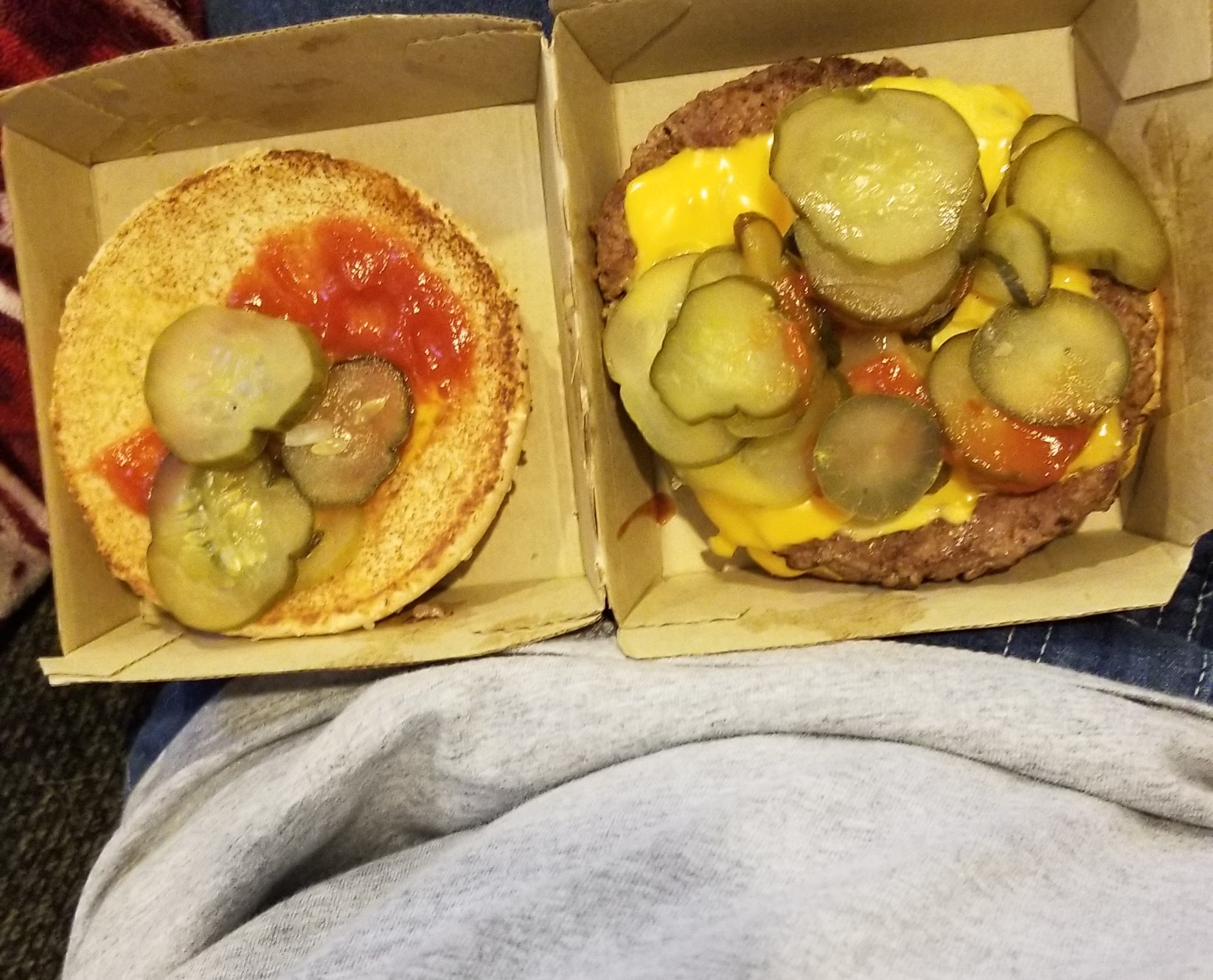 After getting her food we pulled up to a parking spot and looked inside and the dog's cheeseburgers were all covered in onions.