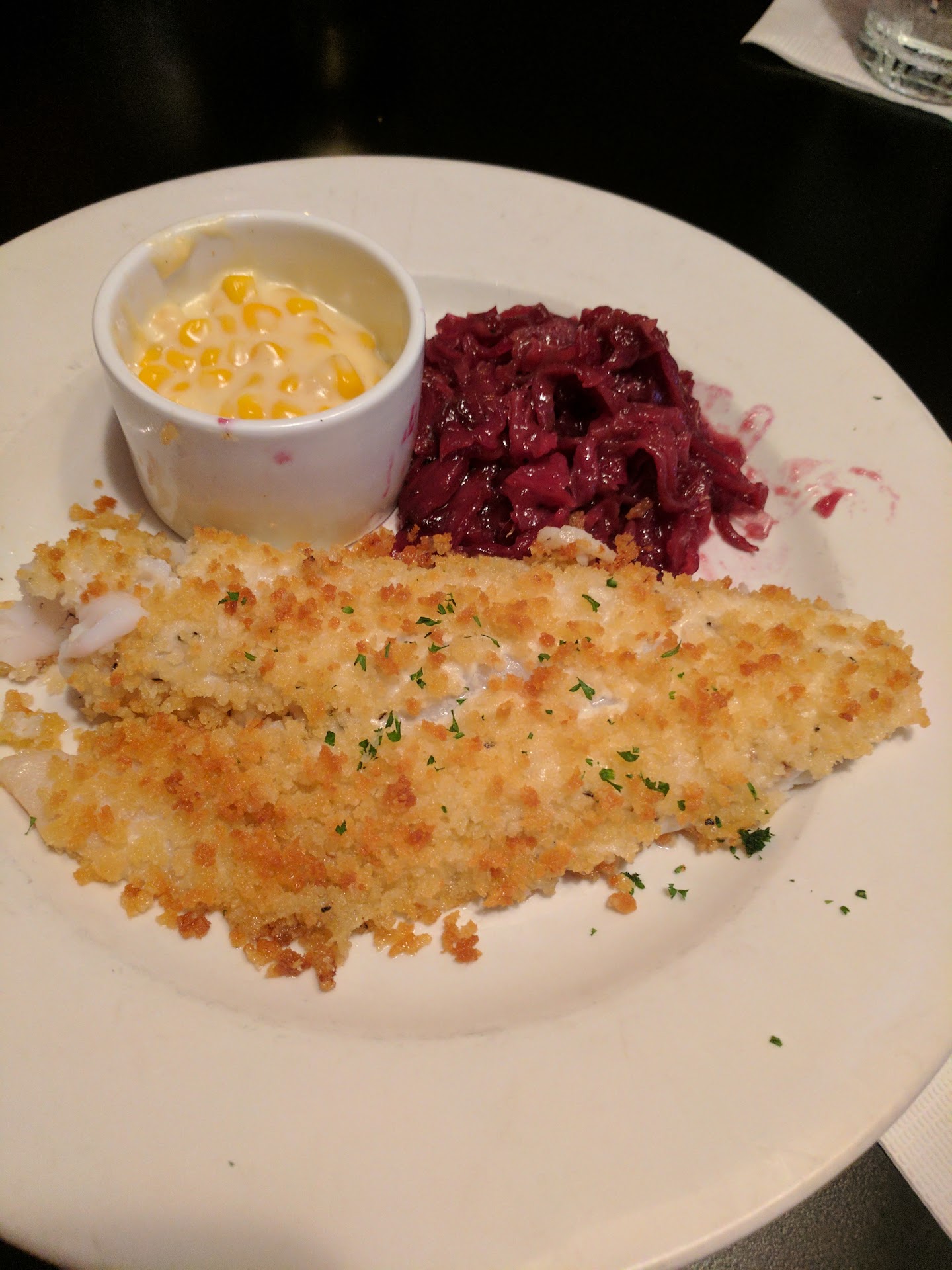 Entrees: husbandâs steak cooked to his liking. Plating, presentation: booooooring. Whipped mashed. Meh. Creamed corn. Meh.