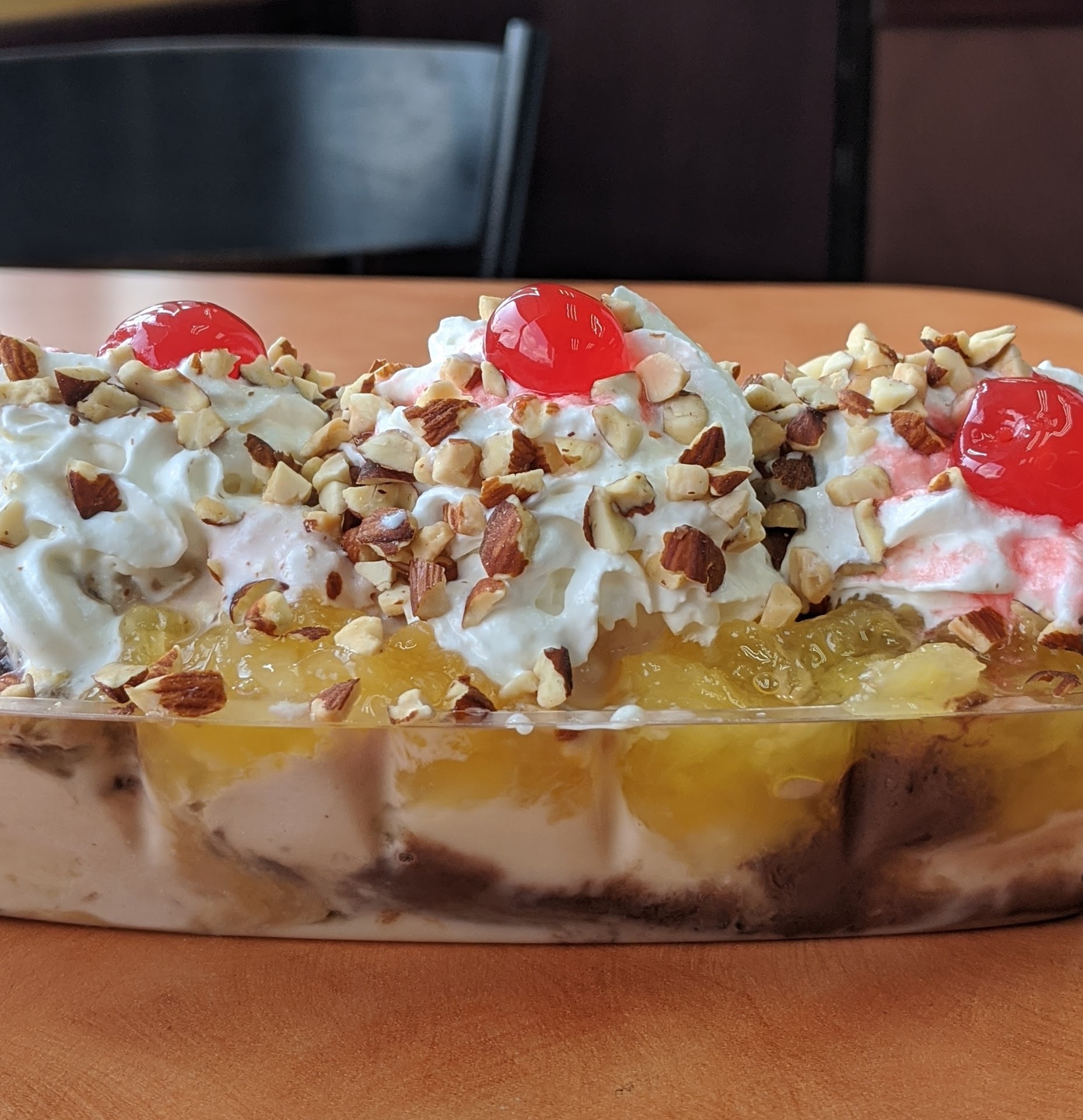 We had banana splits. Yummy, and these were very good. Because of Covid the line that formed behind us were following the floor stickers that measured off 6 feet. That poor guy. Between showing the trainee how to do stuff and waiting on people, he was...