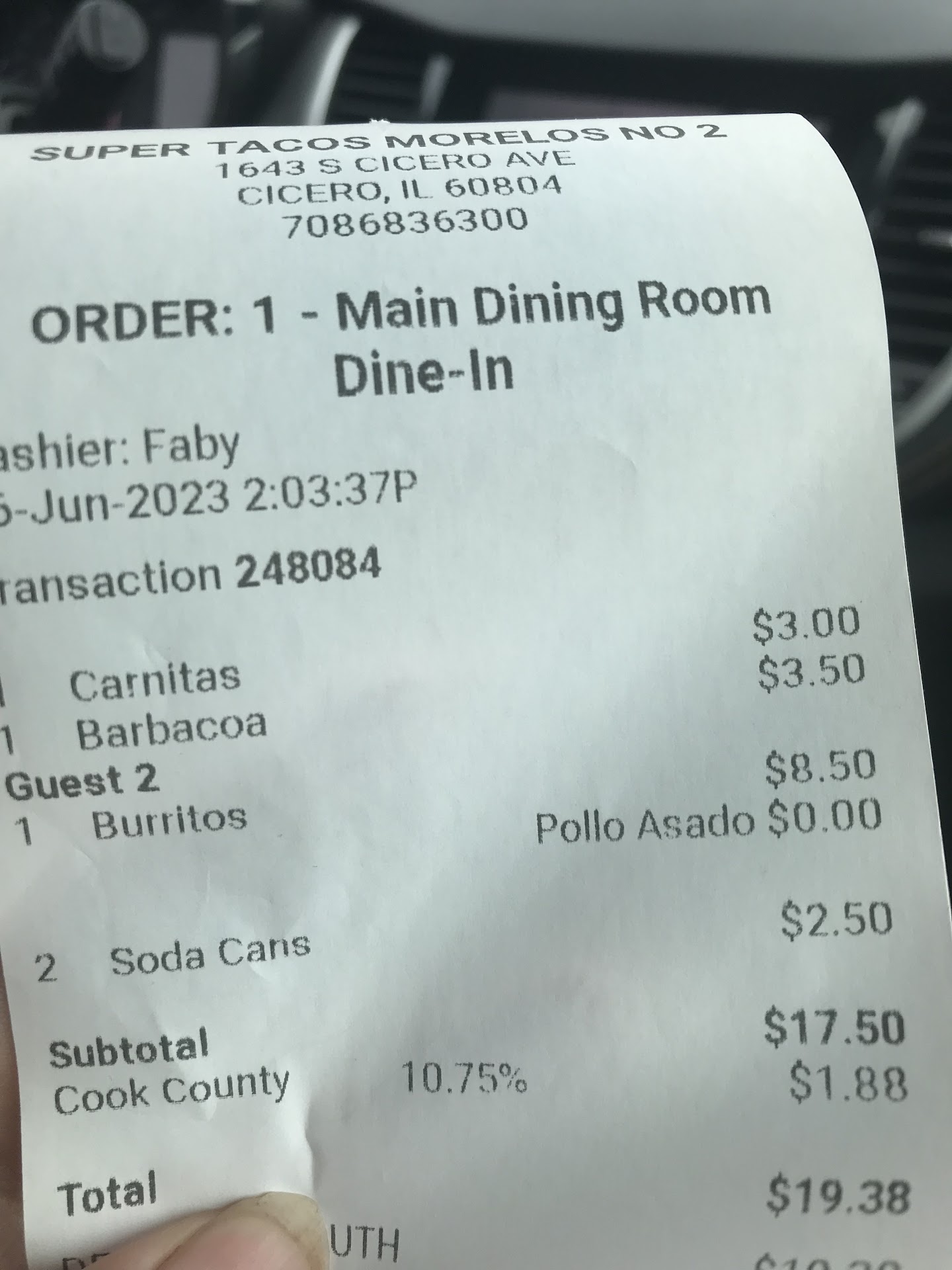 Read moreSuper Tacos Morelos' for the first time today. I called to place my order for pickup. They did not let us down. An almost overflowing pair of heated tortillas are packed with generous quantities of flavorful meat. To be honest, a terrific value. Very reasonable in terms of cost. Get the value of your hard-earned money. A thick, substantial, meaty, warm, and tasty taco (with excellent melted cheese!) costs just under $3.00. metal is neatly wrapped to keep you warm. They also packed the limes for me at no charge when I forgot to buy them! There is no awkward charge or pause. If you're in the mood for some hearty and delicious tacos, I strongly recommend...
