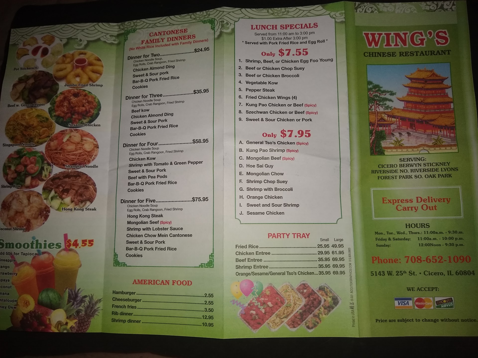 Read moreI have eaten here since I was a kid. now that I am closer to them than my last apartment they do not like to deliver to Chicago even though its less than 2 miles from them. this is the 2nd time in 3yrs that that have delivered yet my family has been loyal customers for over 20yrs. I would understand it if we did not tip but we do, or if it was for a small order but when you are spending over 50 bucks every time you order it makes me feel like they don't want my business anymore! they have cut their hours which suck their prices are average the food is good the drivers are nice. the biggest reason I like this place is that they are msg free!! i hope that they see this and change the few things so that we will...