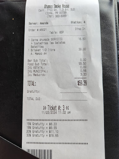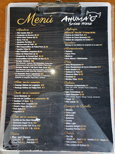 Read moreTenia este lugar en mi lista para visitar. Me gustan los lugares de comida donde ofrecen carne ahumada. Es un arte. Llegamos justo cuando abrieron, sentarnos y atendernos fue rápido. La comida demoro mucho en llegar. El precio de mi plato, "Brisket" con arroz estaba un poco caro. Eso sí, la carne estaba tierna, húmeda y de buen sabor. El arroz tenia carne de cerdo ahumado y se podía comer como un plato solo. La carne de cerdo ahumada con batata frita también estaba buena. Buen sabor a ahumado y las batatas estaban bien fritas. Como pueden ver en el menu, la proteina se vende aparte de los complementos. Estaba concirrido en el tiempo que stanamos ahi. Por lo que observe, se demoraron mucho en servir la comida por que estaban prioritizando las ordenes para lllevar que a las ordenes de los que estabamos ya ahi sentados. Eso no me agrada, si estoy en tu local, debería yo tener mejor experiencia que el que ordena para llevar.