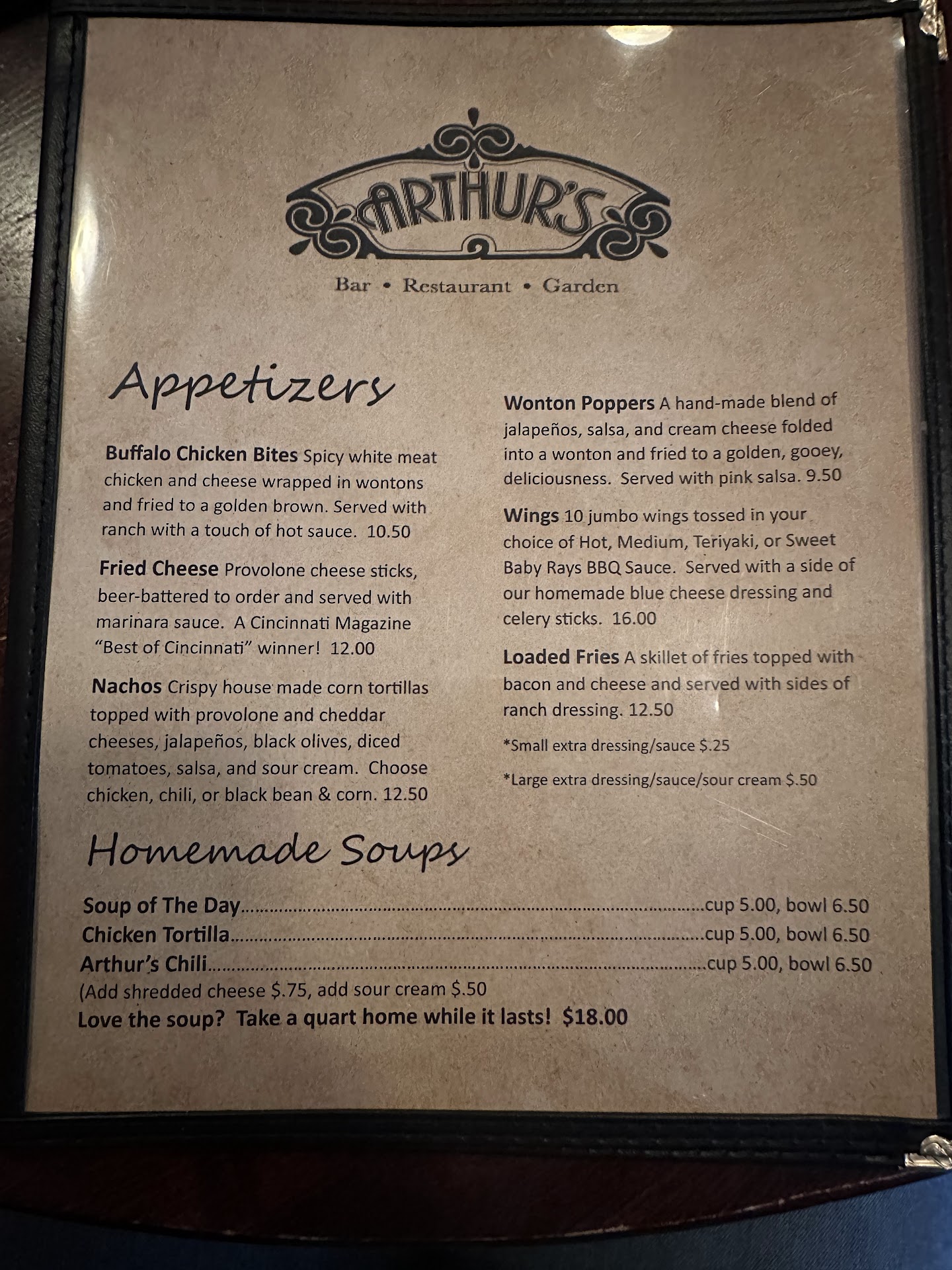 Read moreTonight was our first time ever eating food from Arthur’s & we placed a carry out order. The luau burger was good! My sons said the Reuben was okay. My mom’s Mexican chicken salad was on the small side and my dad’s chili was supposed to be a bowl but we think he might’ve been given a cup. Stuff happens, so we did our best to be understanding, however what made us decide to place a follow up phone call was a 4% carry out fee which was realized was on the receipt when we got home. The person on the phone explained that the fee is to cover the cost of carry out supplies such as to go boxes & that fee has bee implemented for probably a couple of years. I’ve never seen or heard of such a fee with any other restaurant so this was our first and last time ordering carry out from them. It’s a bummer too because I love to support...