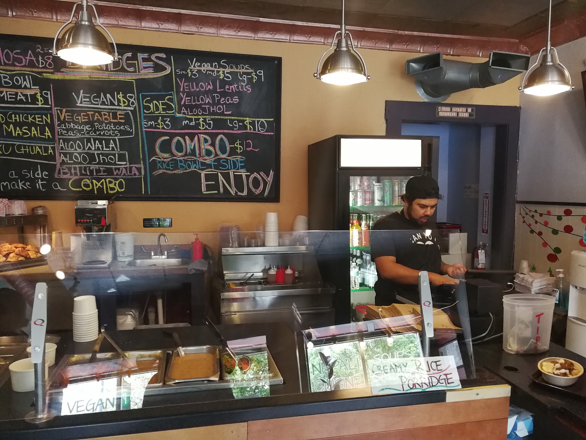 Edit: Came back for dinner on the same day. Found free street parking in the neighborhood. Slightly busier than lunch but plentiful seatings. We sat inside this time. Everyone kept their volume at a respectful level. I really enjoyed the rice bowl combo I got! The streamed pork mono reminded me of Xiao long bao; The jhol that came with the Momo reminded me of Tom Yom soup with cilantro. Both were...