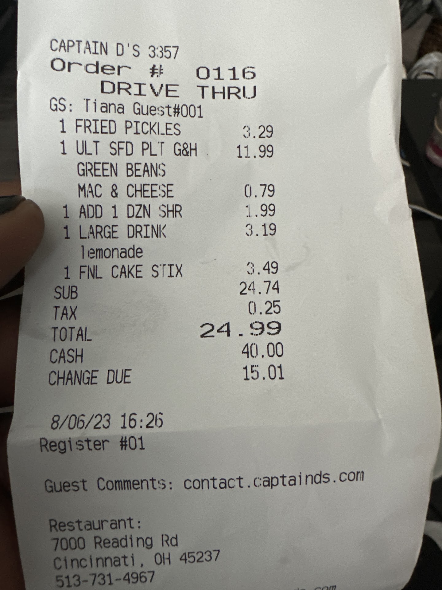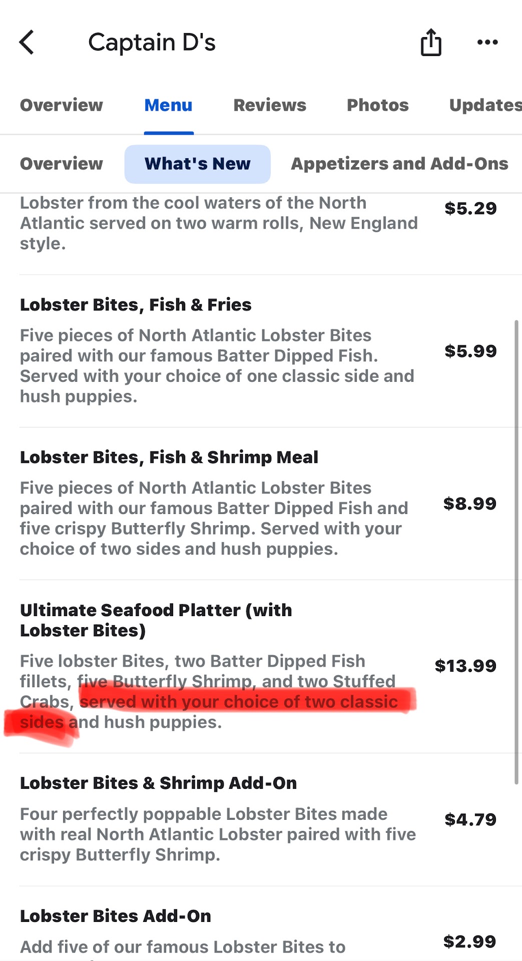 Read moreCaptain D's is just not Captain D's like it used to be. The quality of fish, I rate as 3 out of 5 as the hush puppies was a 4 but the fish a 2.6 and chicken a 2.7. Atmosphere 2.5 as the drive thru pavement had many pot holes. Drive thru and parking lot was crumbling apart and not safe for your tires or car (especially at night and was not well lit which it needed to be for this location. Some of the lights were out on the menu board. Food appeared recently cooked, was hot, Not soft, too firm (on the verge of hard, but not quite), simply not quality fish to me. $28 for 1 two piece fish, two piece chicken and shrimp dinner. Added a piece of fish and chicken, hush puppies and one piece of cheesecake. The price was fair enough...., but they forgot my cheesecake! They did a good job getting about six cars through the drive-thru in a very reasonable amount of time. Staff was pleasant at the speaker and at the window. I would personally not go back to this location and maybe not a...