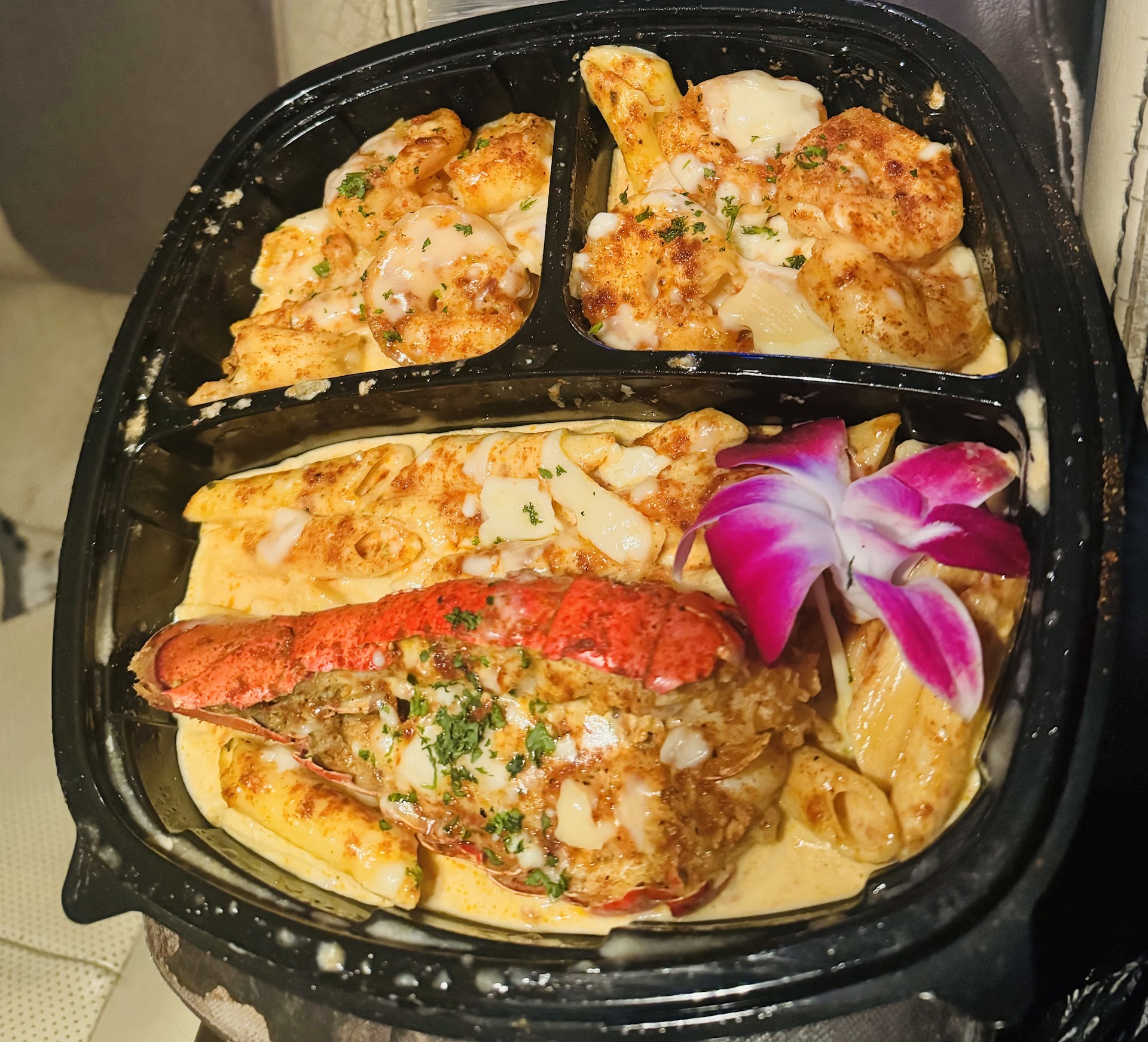 Food: okayy I gave this one a hard thought and to be honest I ordered the Lobster and Shrimp Alfredo Presentation was FIREEEEE as you’ll see, even got a little flower and it was so cute … now mind you I payed 40$ and the portion was very little I know it’s a lobster but there wasn’t a lot of noodles And the sauce was watery not thick and full of seasoning.. but the lobster and shrimp were seasoned well