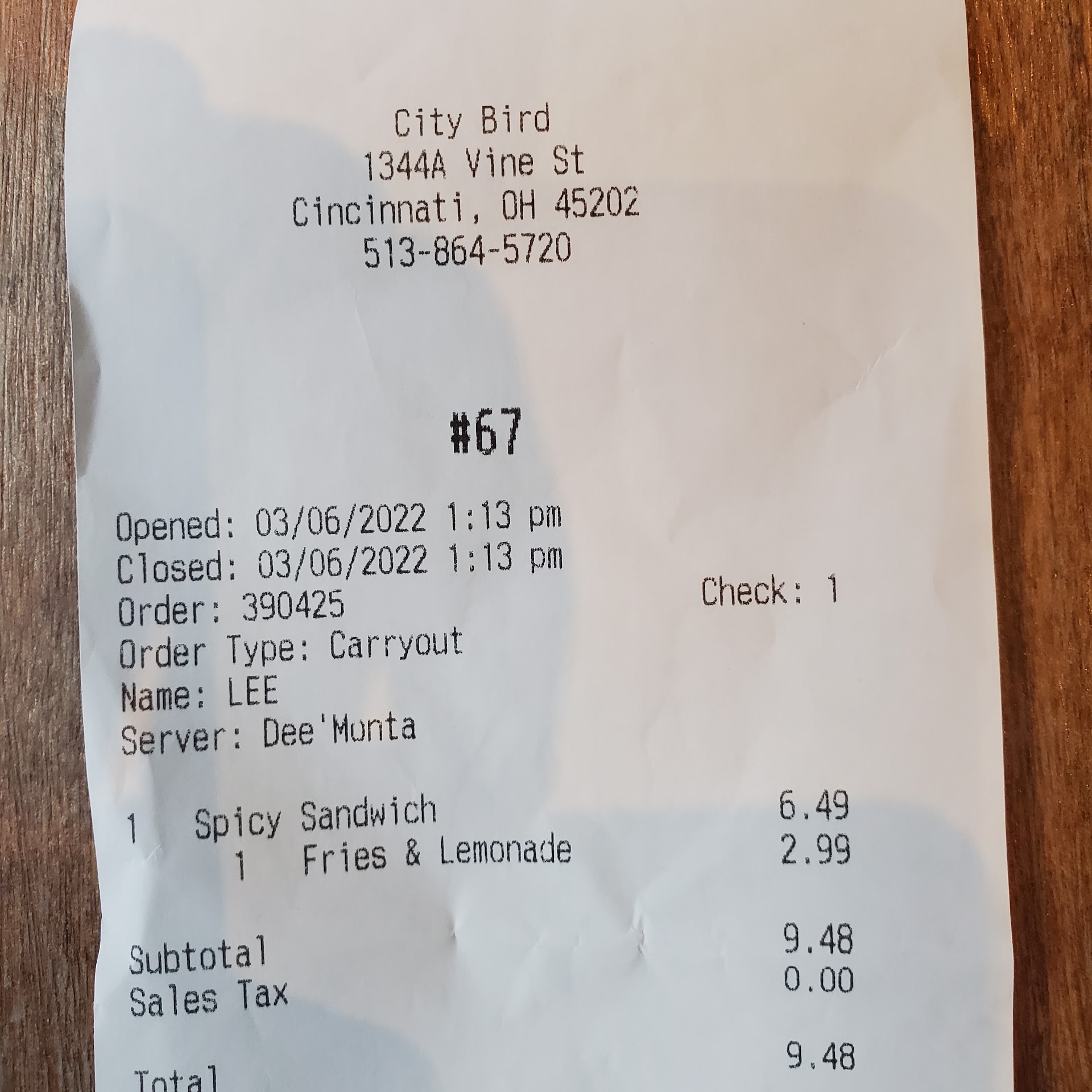 I called my order in today at 12:30 for just A simple spicy sandwich. The server Dee ' Monta took my order, told me the time, 5 minutes, and I came 20 minutes after that time.