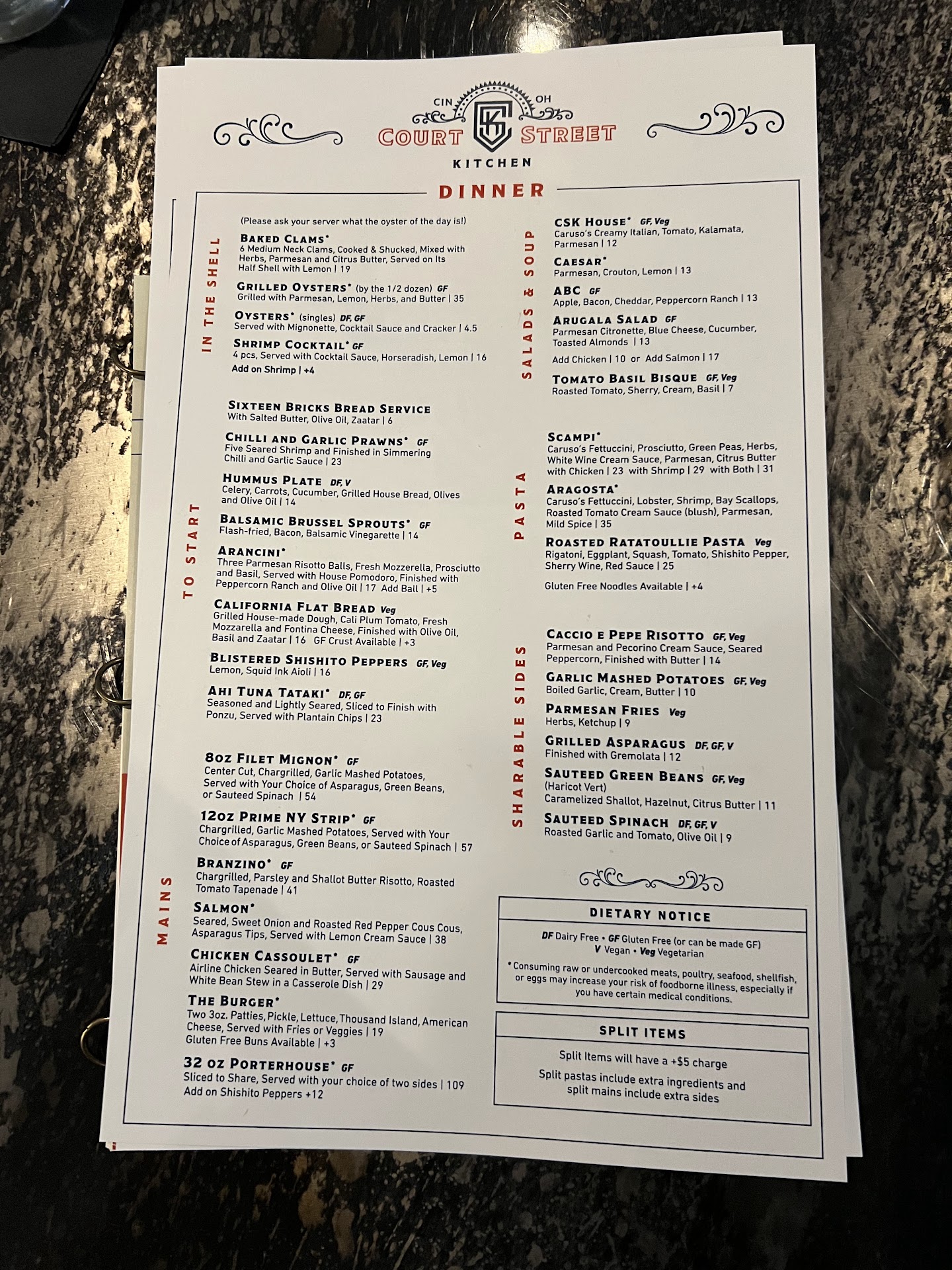 Letās talk about food. My girlfriendās diet is gluten free (GF). So many restaurants donāt understand the problem GF people have when eating out. Court Street Kitchen has many GF options. Our server noticed my girlfriend was not trying the bread that was served and, on her own, brought a basket of GF flatbread to the table. I mean, talk about paying attention. Wow!
