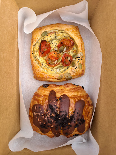 Lovely staff, efficient service, and an impressive selection of baked goods on a Sunday! Great croissants and laminated pastries available in both sweet and savory. A small table is available for up to 6 people to sit, but it's mostly a take away situation.