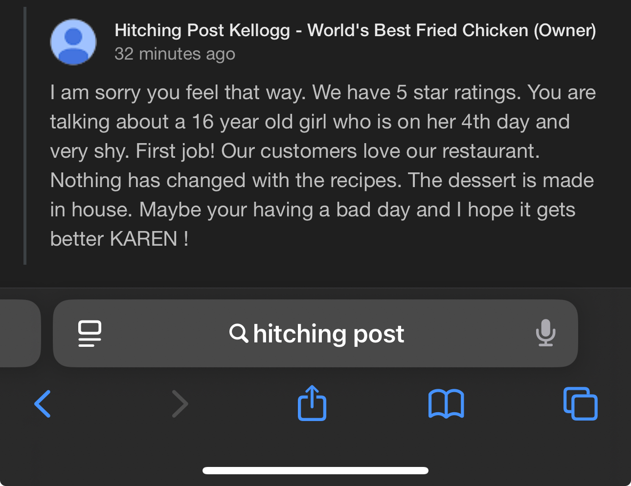 Update: By the very professional response from the new owners of Hitching Post, I definitely will not be back. From what I have heard from the previous staff and what I have seen of their reaction to a personâs opinion, I completely agree not only are their attitudes distasteful, so is the food. There are several reviews from recent that say the food is inedible, I mean how can you mess up a thin burger⌠you burn the burger on one order and itâs undercooked the next. Another few reviews also agree that the chicken isnât the Worldâs Best anymore. Maybe instead of calling people Karens, you work on your professionalism and how to train your staff on how to cook properly and the âsame recipesâ because they were obviously off! đ Oh, 5 stars⌠you mean 4.5- so not quite there and most of those reviews were before you all took over, letâs see if you all can keep that rating. 𤣠(Added the picture of their response since they...