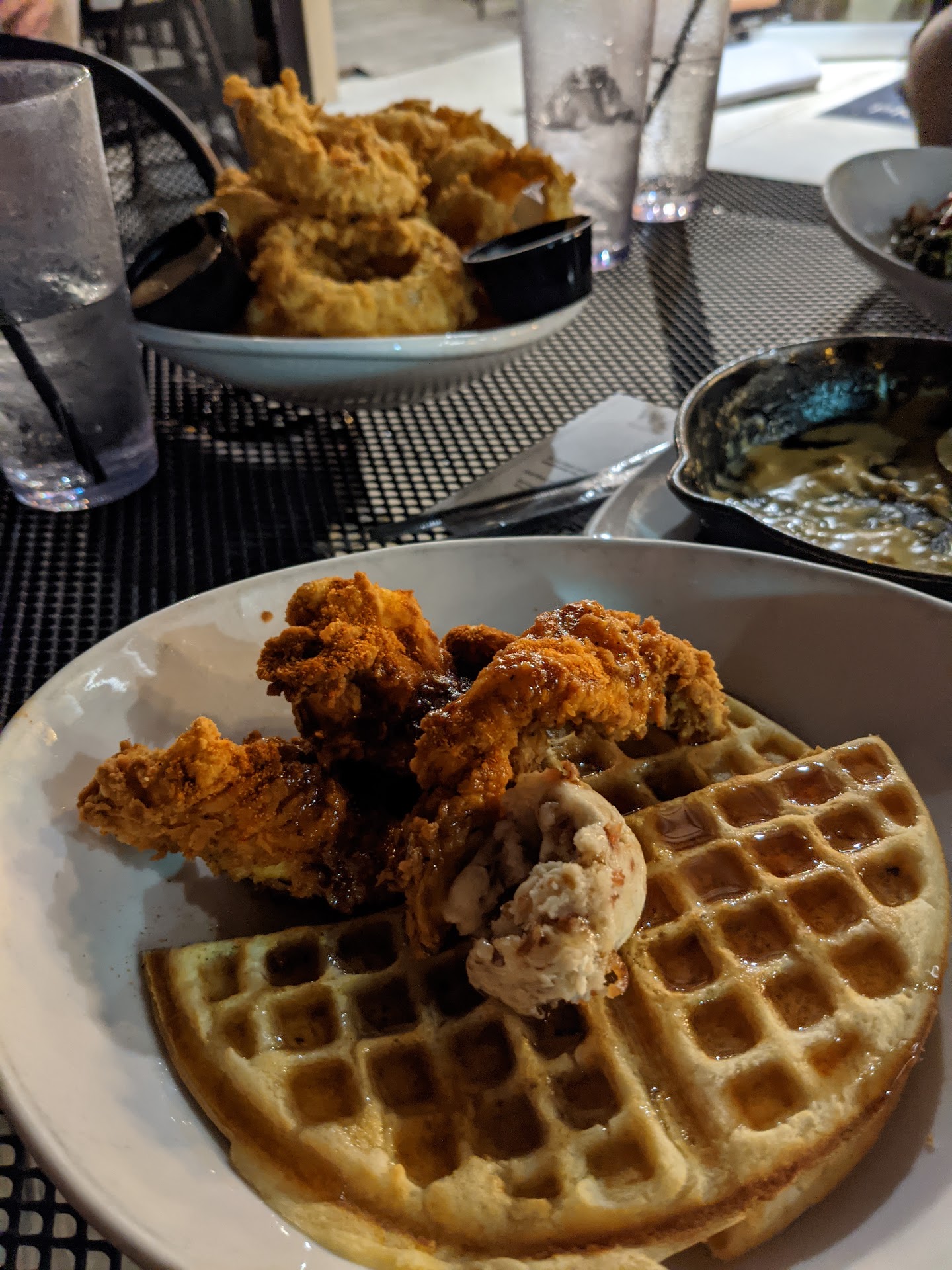 Read moreThey advertise having gluten free options so we decided to give them a try. Asked the hostess if they had a gluten free menu and she said no. Asked if the menu was marked with which items were gluten free and she said our server would be able to assist us. After we were seated I asked our waiter which menu options were gluten free. He informed us that they had gluten free bread for the sandwiches and a gluten free crust for the pizza. I inquired further about which sandwiches or pizza would be able to be made gluten free and he said if an item had gluten they just wouldn't include it when they made the meal which was horribly unhelpful to say the least. Tried one more time and asked specifically if any of the appetizers or sides were gluten free and this dude just stared at me for 5 seconds straight and then turned to my partner and asked if he wanted anything to drink and straight up ignored my question. Literally no allergen information anywhere so you can't even order a salad because you have no idea if they just won't put dressing on it if it's not gluten free. I like surprises as much as the next person but I really don't want to order a tantalizing sounding sandwich just to end up with some gf bread topped with lettuce because they removed the gluten items. They do just remove it too, my order was supposed to have fried onions so I asked if they would be replaced with regular old onions instead and he kind hmmhhmmm'ed at me which i thought was a yes but turns out it was a no. They just removed the crispy onions. I paid more money for the gluten free option to get less food. My better half said his food was pretty good and the view was phenomenal so if you don't have any dietary restrictions and money to burn then give this place a try, otherwise stick with places like Fretboard and their affiliate restaurants because they're absolutely amazing and care about making sure everyone has a great dining experience. The price is not worth the service here, our waiter was nowhere to be found from the time he took our order until the time he slapped the check on the table and then he hovered around trying to get us to leave so he could seat the next tip $$$ in line waiting to eat even though I still had a plate of the blandest food...