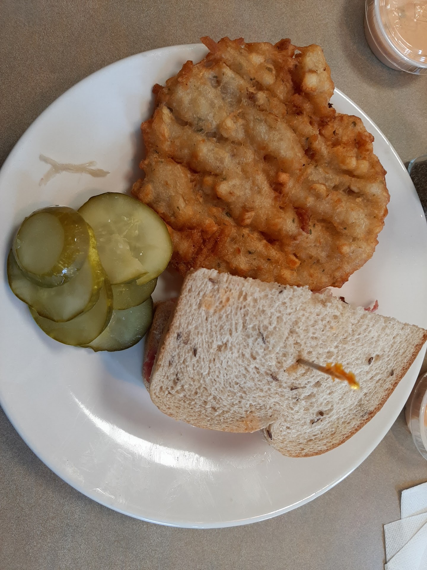 The food? Well If you've ever been to a kosher deli in brooklyn, then you'll know the menu mostly. Though they have their own little quirks like these delicious potato pancakes that they have some special secret formula for and comes with all the sandwiches. I particularly recommend their fish meals by the way. Although the Cod Reuben was slimmer than it was the last time I passed through a couple years ago, but I think C-19 is shrinking everyone.. the price is significantly higher then it used to be. But everyone must deal with inflation today, and the food is worth it.