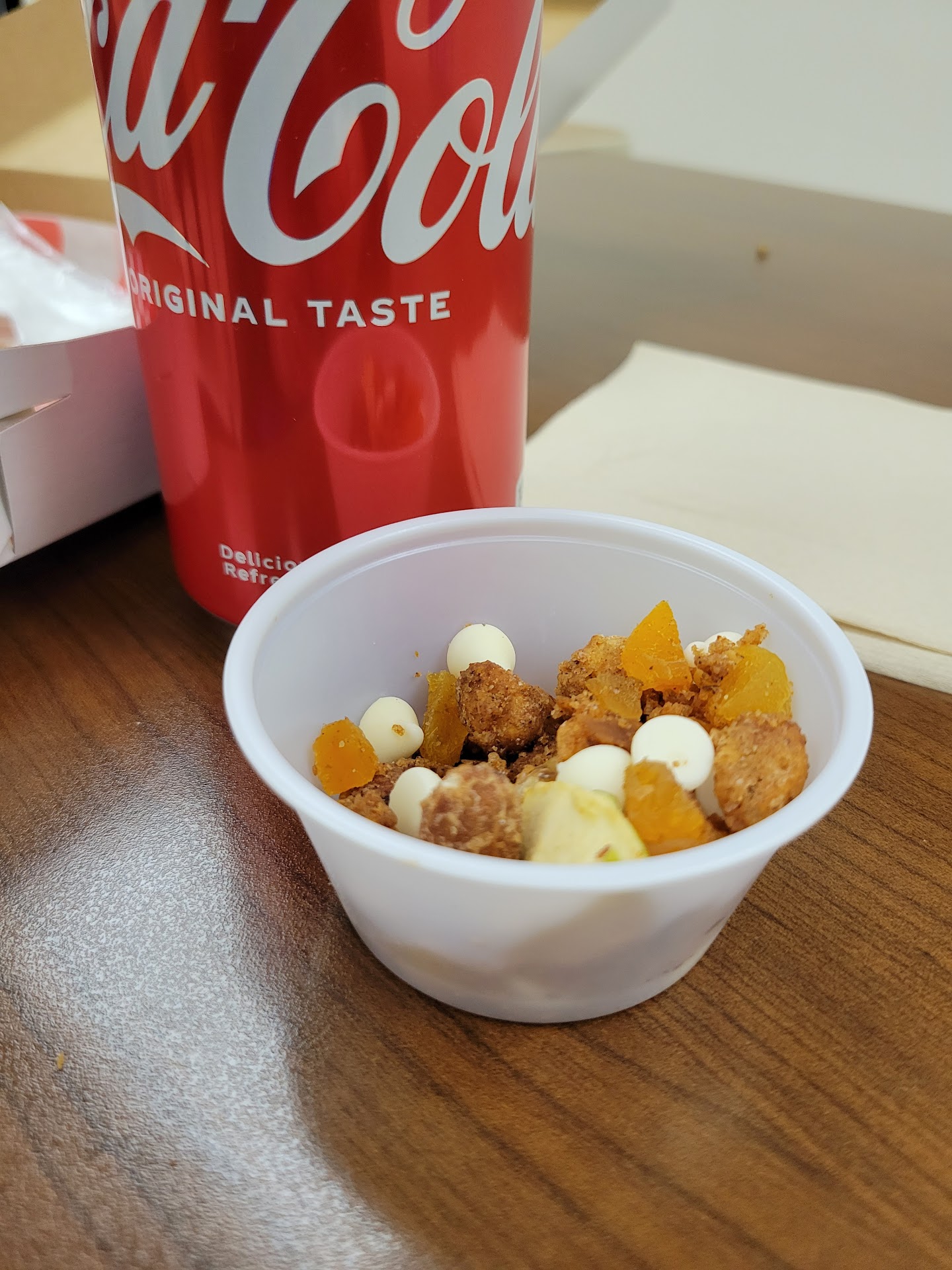 My pizza was flavorful but mostly crust. The candied nuts have a spice that sneaks up on you, so be aware if you are sensitive to heat. The size of the nuts was also supremely disappointing for $2.50.