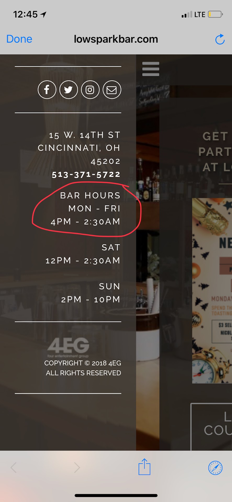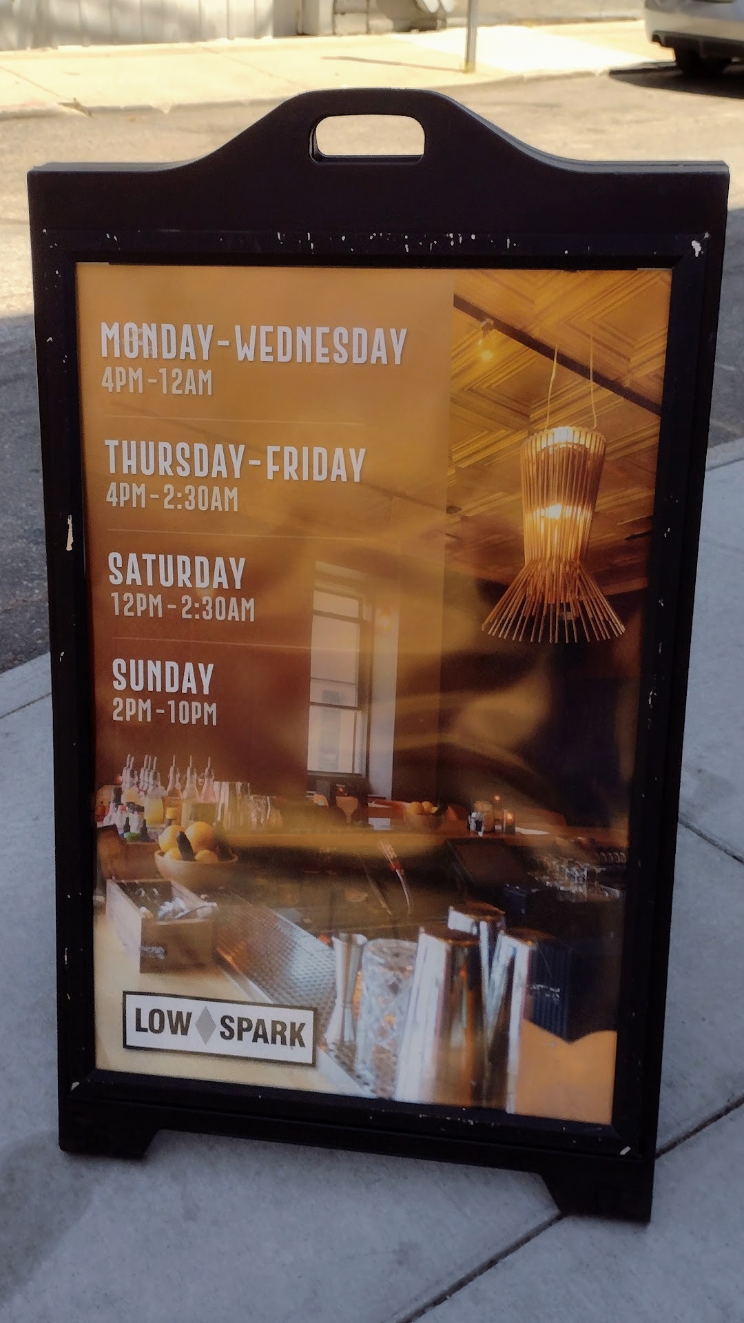 My wife and I go to Low Spark somewhat frequently before we go out to dinner. We went there on July 24th and, in all fairness, the place was jammed and there was only one bartender on duty. I ordered 2 drinks for myself and 2 for my wife both of which were on the 4pm-7pm special list. Apparently the bourbon specified in my special was not available so the bartender substituted another bourbon and added an additional charge. Unfortunately she did not mention this to me the first or second time I ordered my drink. As we were leaving I went to the bar to pay my bill and only after looking at it and questioning the price did she inform me what she had done. My impression (but, of course it is only my impression) was that she was hoping I would not notice. She then offered to comp one drink (which I did not accept). She seemed to miss the entire point that she should have told me when I spoke with her 2x ordering drinks. We love Low Spark but this left a very bad taste...
