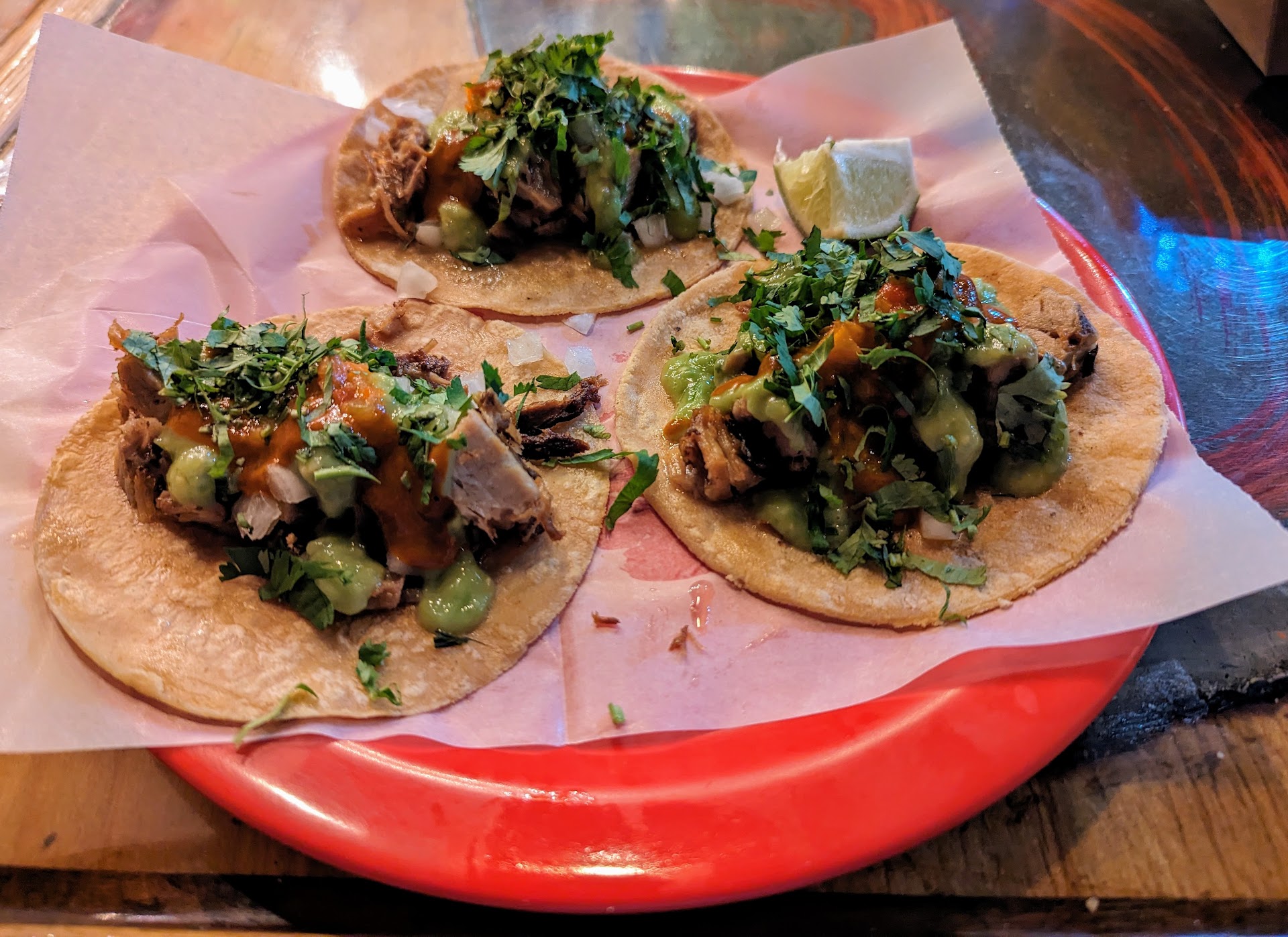 cool staff, quick service, and absolutely delicious food. If you're a fan of the original location you'll like the fact that this place has other Taco options, different types of sandwiches, and a full liquor license. I don't drink, but it's great to have the option and availability downtown for good affordable food.I got myself a chicken torta and it was gigantic, it could have easily been two meals, but I was pretty hungry so I just made it a single one and had some delicious bread for later. My girlfriend got three tacos, a mixed variety and was happy with every single one of them. The al pastor beef barbacoa, and chorizo with potato were all fantastic. about the only thing that's disappointing when comparing it to the original is that they don't do any of the super great homemade tortilla chips and salsa in a bottomless serving, but they still have great chips and salsa available if you want to buy them by thepack. Lastly the space is really awesome and all the recycled materials make it look...