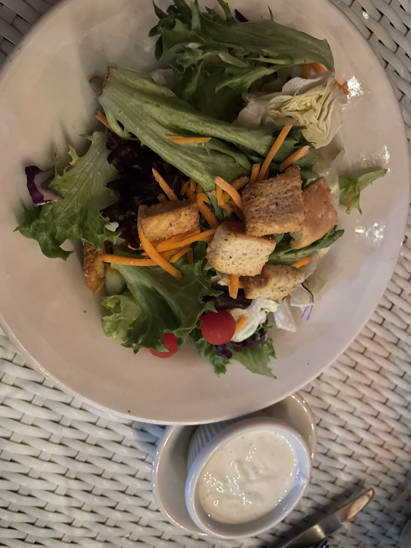 WIFE: My wife had the Wedge salad and onion straws. She had already torn into her Wedge before I got the picture. She said it was a good portion, had enough toppings, her only negative was she would have preferred diced tomatoes over the grape tomatoes they provided.