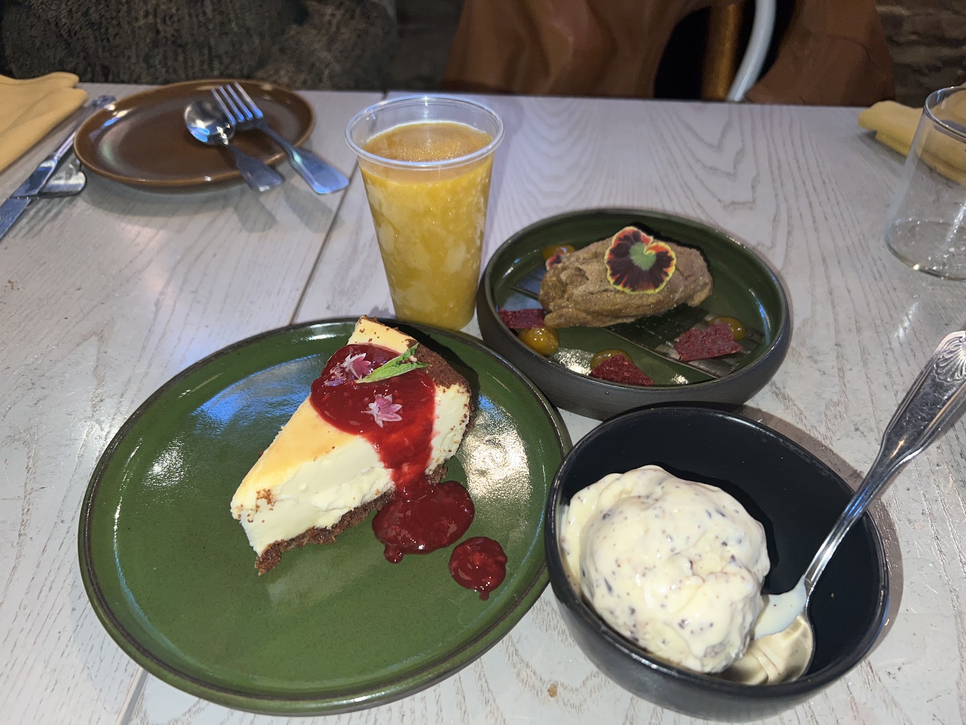 We ordered all 5 entrees; we especially liked the rabbit, pork belly, and lamb steak. The rabbit was jerk flavored (house made) and so tender. The lamb was cooked perfectly, with (also house made) jalapeño mint jelly on the side. The pork belly was smoky and crispy. The trout was also a hit at the table, and unsurprisingly it was cooked perfectly. The award for underdog hit, however, goes to the stuffed collard greens. A vegan dish stuffed with jackfruit, we weren’t expecting it to blow us out of the water. But the smoky spicy flavor of the stuffing and the perfect texture of the collard wrap impressed me, and I ended up begging to take the leftovers of it home.