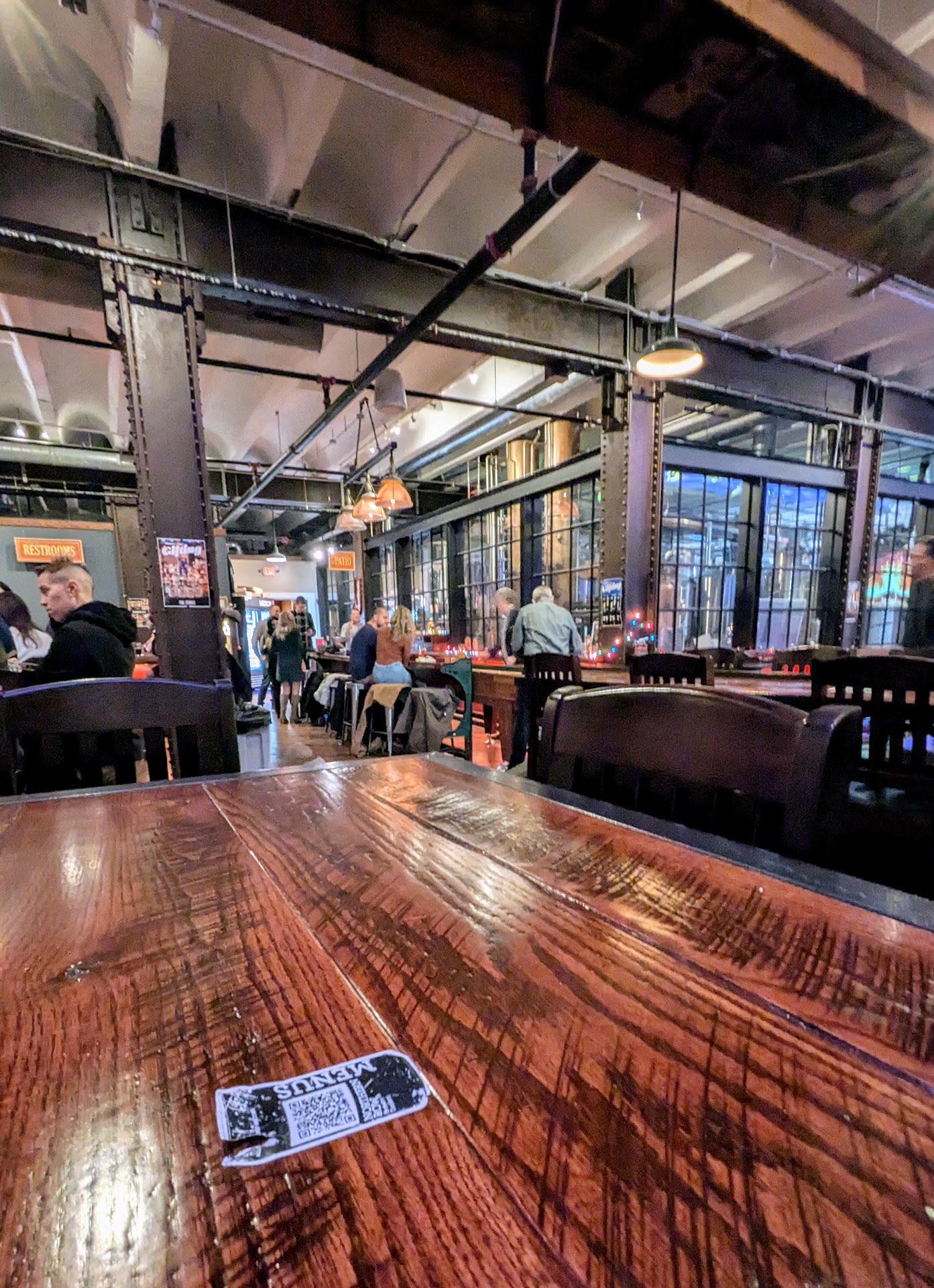 This is an action filled glossy taproom bar/restaurant at the northern tip of Over The Rhine in downtown Cincinnati. They only have a small parking lot, and it's tough to find good street parking, so arrive a little early to find space in their lot. Inside it's a very large establishment. It's got a masculine, old-timey lumberjack feel to it. Lots of FC Cincinnati soccer paraphernalia around. Huge, high gloss, long natural wood Oktoberfest-style tables. Huge, tall, divided light, turn of the century industrial windows. Cool, tasteful, neon lighting. Huge beautiful bar. You can see, but not smell, the vats of brewing beer fermenting in the tap room section behind a dividing glass wall. Lots of historic Cincinnati artifacts -- like big bells and canoes hanging from the ceiling giving the place an interesting historic, old time 1920 Cincinnati vibe. Lots of young people around standing, talking, laughing, sitting at tables, playing games. You can order drinks quickly and easily at the bar, which has multiple, attentive bartenders, and open a credit card tab if you like. Or have a seat at one of the tables and a waiter will come take your order from the menu. There's an extensive food menu with quite delicious options- much better than the typical bar food. My two sons both ordered the meatball sub which they said was delicious. I had the Reuben Sandwich for lunch okay a few months ago, and it was delicious. Last night, I had the hummus Greek gyro vegetarian option which was very good. I also tried a gin and tonic flight which was fun. My sons loved the wide beer selection.