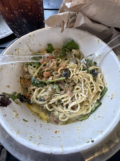 I recommend the Penne Carbonara with Salmon and Olives. It is hard to find something -that- specific and made to order while you wait.