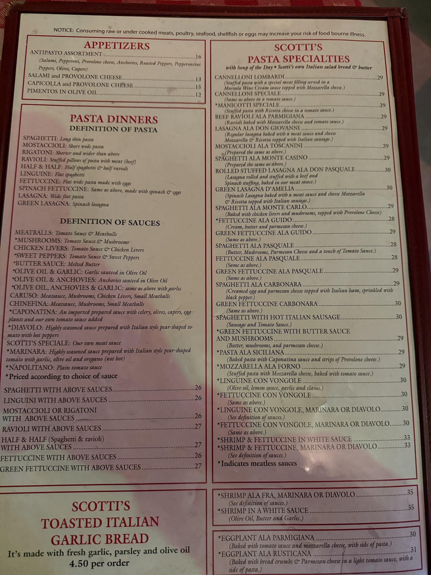 I wished there was a below zero rating for the experience we had to endure at this restaurant. We were a party of 15, came to this restaurant for a pre Christmas family reunion. Waitress and waiter were awfully rude (older lady and skinny bald guy). We initially reserved a table for 13, but we had two additional people that joined us last minute and the waitress sat them by themselves claiming there was no room to join an additional table to ours (which was fine with us if it wasn’t for her trashy attitude as if we were ruining her night). Then half an hour into this experience, we had ordered bottles of wine and waiting for the rest to join, the waiter came and tells us we have to order because the table was reserved after an hour and that he has to put our order in so we can eat and leave before the next reservation!!!!! Never have I ever been so rushed as if the Pope was coming to have dinner there and they need to evacuate the premises. At that moment most of us were ready to walk out after this poor service. We decided to stay since two of us had already ordered food. We ordered mostly from the pasta menu. The food was HORRIBLE. The lasagne looked like red vomit. The Alfredo fettuccini was disgusting we couldn’t even finish our plate. It was literally the worst Italian restaurant we ever stepped into. Each plate cost more than $25 which I would not even eat it for free. What kind of business with such a history, fails miserably in food and customer service?!! Scotti’s Italian Restaurant should be Schitti...