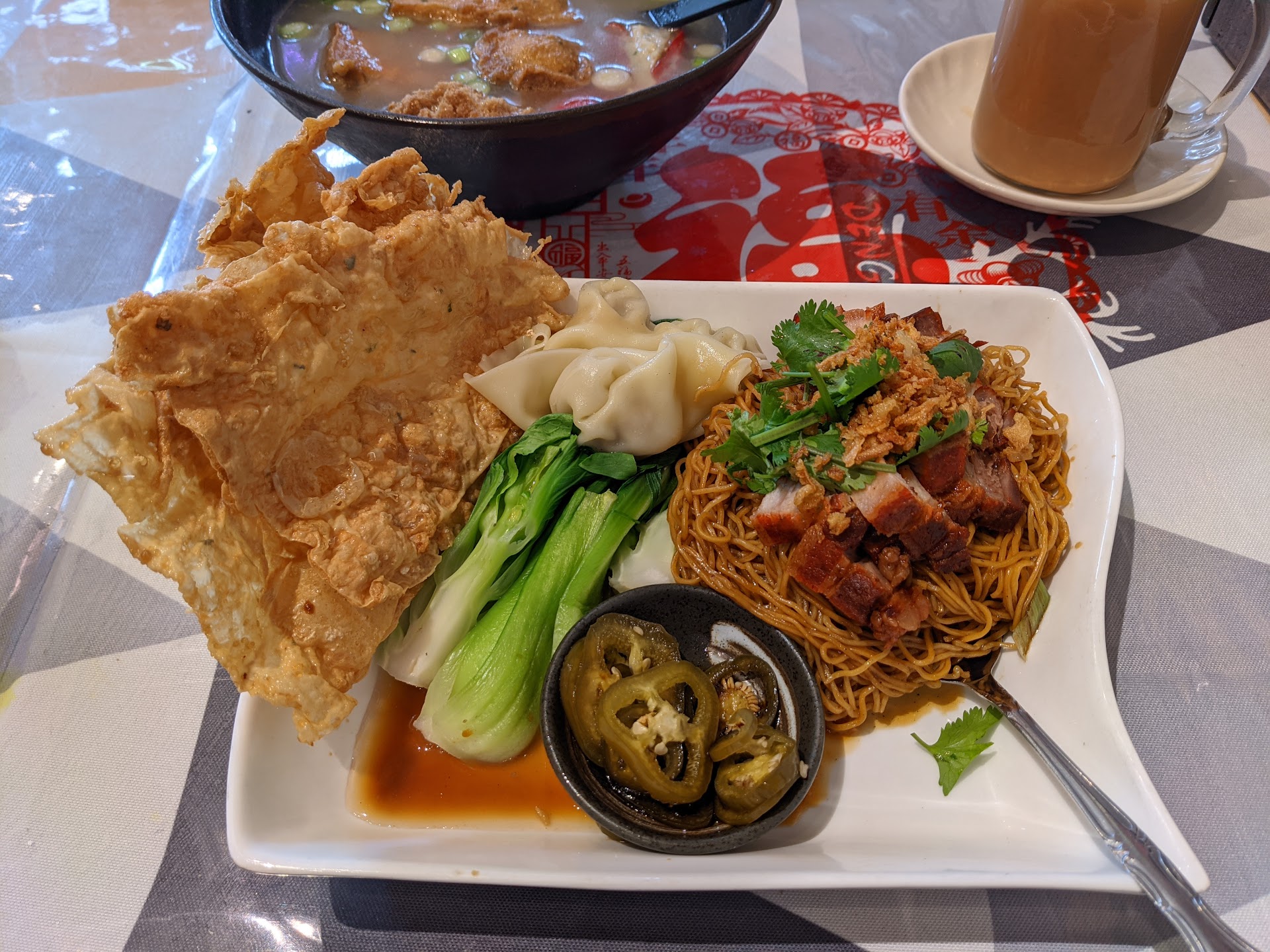 During this visit -- see photos below -- I had the Malaysian teh tarik, the Hakka yong tau foo (or yong liu) -- which is not on the main menu and which you would have to check with the kitchen for availability, and the Ipoh-style kon loh (i.e., dry rather than the Hong Kong soup style) wonton noodles with char siu (Chinese barbeque pork).