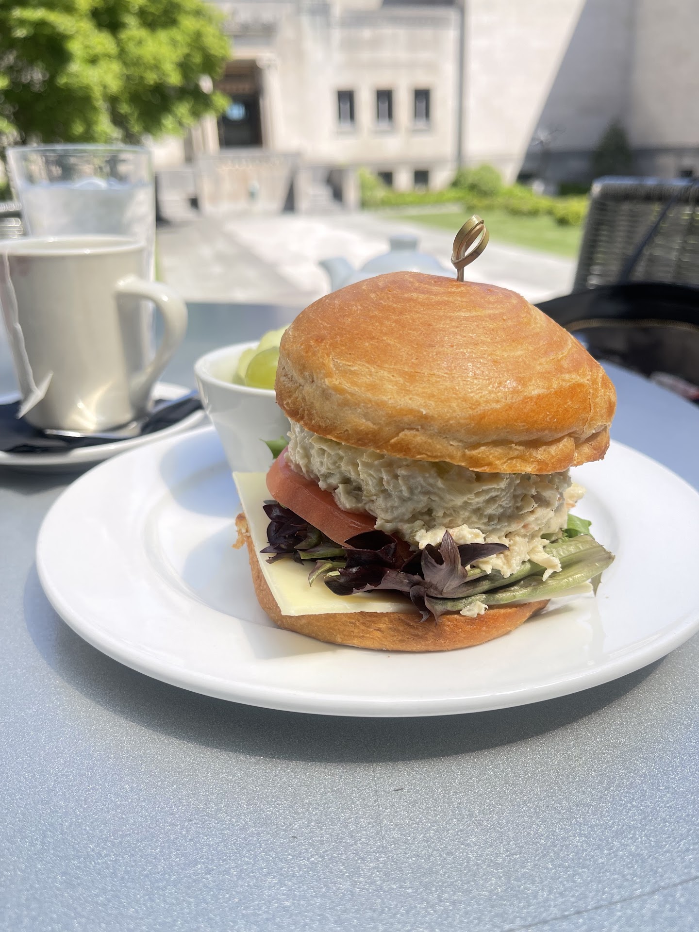 My server -- Matthew -- was a true treat. Attentive and kind even as service picked up. I had the chicken sandwich with fresh fruit, hot tea and a glass of rose. The sandwich was AMAZING. The bread it was served on was to die for, not too crunchy or hard but a great balance of crips and soft. The chicken salad was flavorful. Such a simple but amazing lunch! I was also able to work outdoors in a beautiful environment, birds and bees buzzing into the new season.