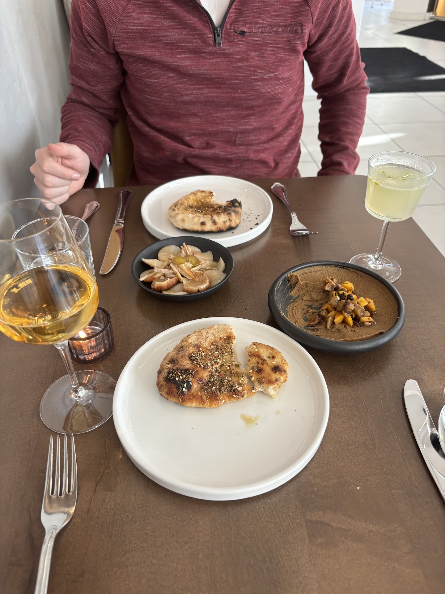We ordered the eggplant dip to start, it comes with fresh house-made pita. It was delicious, but the presentation was not great as the dip was served on a plate that was the exact same deep purplish grey color. When it first hit the table I honestly couldnât see the dip and thought the small pile of garnish in the center was the entire serving and thought âoh no.â Otherwise thumbs up on the eggplant dip, it had a rich warm earthy flavor and the pita was served hot and had a nice dusting of herbs. And they will bring you more pita if you like.