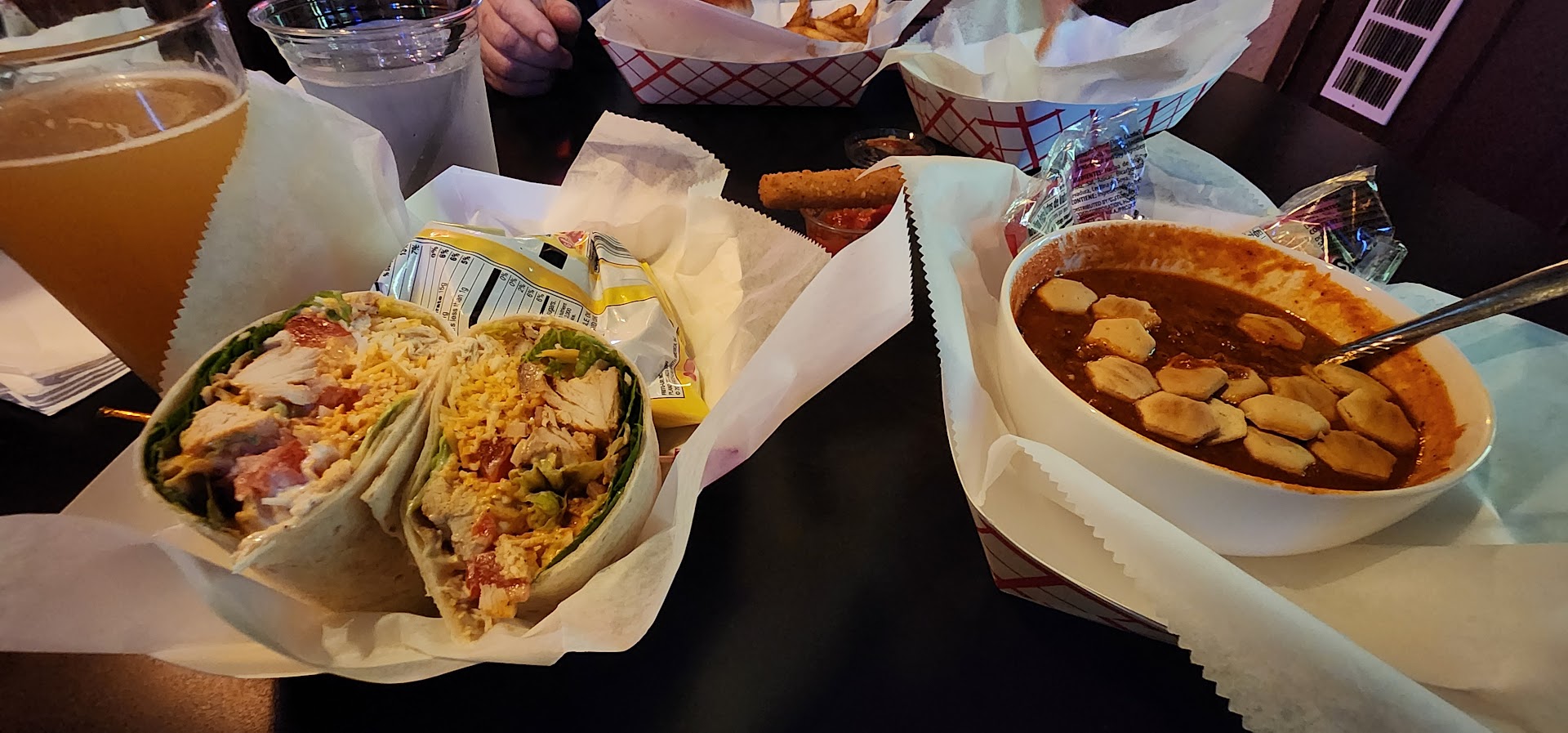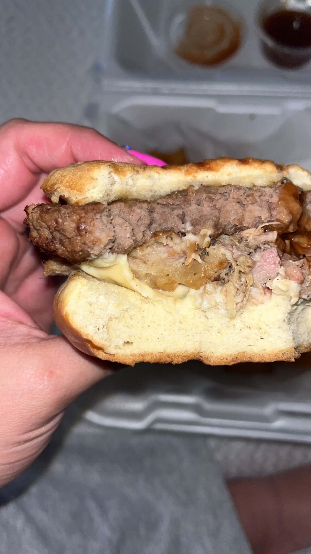 I got the Big Pig Burger it was a microwaves burger or a burger that had been sitting in water forever. It was gross McDonaldâs would have been better. I was expecting a nice grilled burger with pulled pork on top. The fries were clearly hours old but I donât send food back.