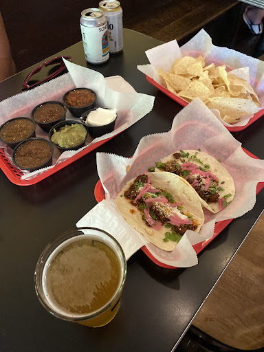 You place your order at the bar. They have a few taps and a generous supply of liquor. Check their board for both food and drink specials. There's also about 3 refrigerator cases with canned and bottled beer you can purchase. (Fun fact, Little Kings is normally 2 for $5.) The food is sort of build your own ala carte. You can any meat/tofu, and veggies to orders. Hubby and I got the quesadillas and an order of nachos with queso. And there was plenty of food! The entrees normally.come with chips and your choice of salsa. The mild was definitely flavorful! The medium lacked the flavor but had a slight bit of heat, but not overpowering.