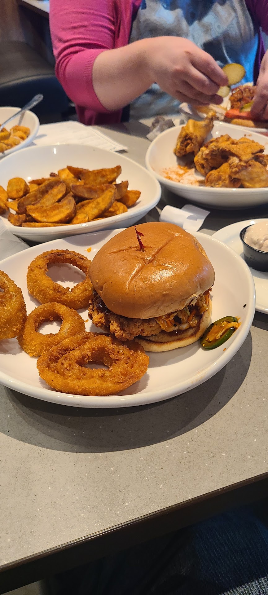 Read moreThe food is a little over priced.... However, most of the staff are kind and courteous, but there were two younger girls doing prep work in back where I could see from where I was seated, it looked like she was putting maybe potato wedges into plastic baggies like pre making them or whatever... After I had said something to my server about her not wearing gloves another young girl walked back there and started helping her do the prep work.... They each only had one glove on one hand, and was sticking their ungloved hand inside the little plastic sandwich baggies to open it therefore any bacteria, germs, hair, etc. that was on their hand went inside the bag that the food went into and they got an attitude about me saying something about it....!! For a 10 piece order of boneless wings fried with sauce on the side, an order of potato wedges with cheese, 2 Cokes, and pretzel bites plain with caramel on the side cost us $38 plus the tip.... In my eyes that is a little high for the amount of food that was ordered.... It shouldn't cost $40 to feed 2 people.... They charge like $2.65 for a soft drink we got 2 which was $5.30 which I feel is absolutely ridiculous.... I understand making money, but you shouldn't make your customers feel as though they are being ripped off.... What was it like 6.99 for what amounted to the size of 1 soft 🥨 cut in pieces.... A basket of potato wedges add shredded cheese $4, and the 10 boneless wings fried with sauce on the side were like $14..... Then they do false advertising, and tell you if you download the app and sign up you get a free starter, but they don't tell ya that you only get it if you spend $15 before tax and gratuity til after you do...