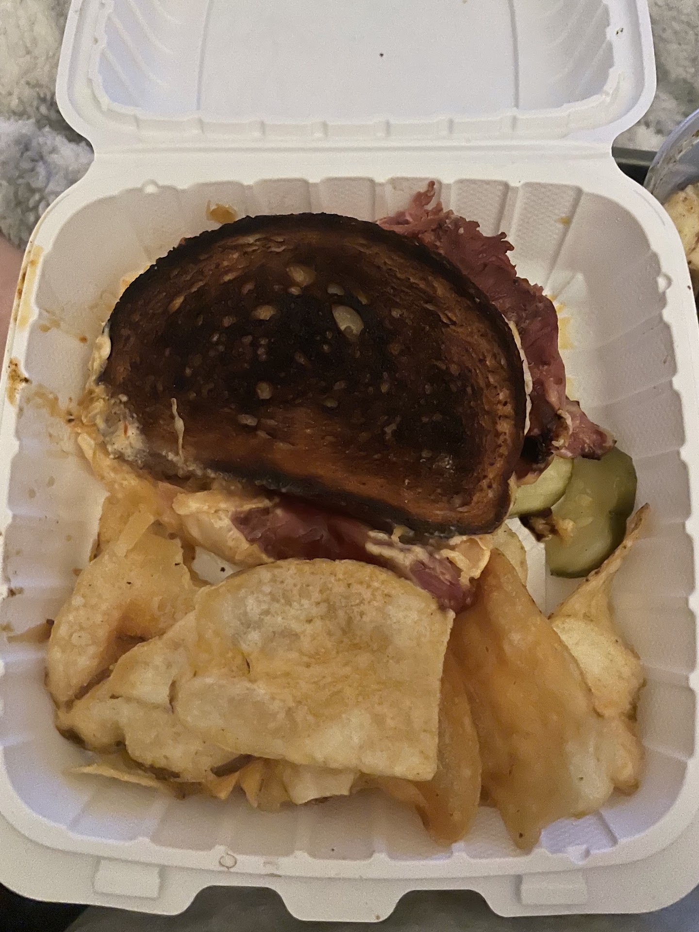 I stepped in the door at 11:45am (just before the lunch rush) and not seeing anyone who looked like wait-staff, smiled politely at a woman behind the bar. "What's that look for?" she said with a tint of hostility. The experience went downhill from there. I seated myself and there was only a drinks menu. I saw a rack of folded paper menus, so I took one to be able to order immediately when any of the wait staff did notice me. That took more than 10 minutes. After ordering, (bear in mind, this is before the lunch rush) its another 15 minutes until my Corned Beef Reuben comes out. A Reuben is my favorite hot sandwich, so I order it a lot of places I go. I nearly choked on this one: the meat was as thick and tough as the sole of my shoe! I have never had worse corned beef, and there's only one way to make this forgiving brisket tough: cooking it too fast. Since I was on a schedule, I choked down half the sandwich, then flagged down the waitress and asked for the check. She collected the crockery, and disappeared. And I waited...and waited some more. Just before I was ready to do jumping-jacks to get her attention, she finally made her way around to me and asked me if I wanted the check. (Read the paragraph above.) Yes. Yes, I wanted my check so I could leave The Jug Handle Inn and not come back. For the poor service, the rude greeting, and the poor food, I provided a 60% tip. At least my beer was cold which was consolation for being 20 minutes late back to work. Maybe the evening staff is better. The lunch...
