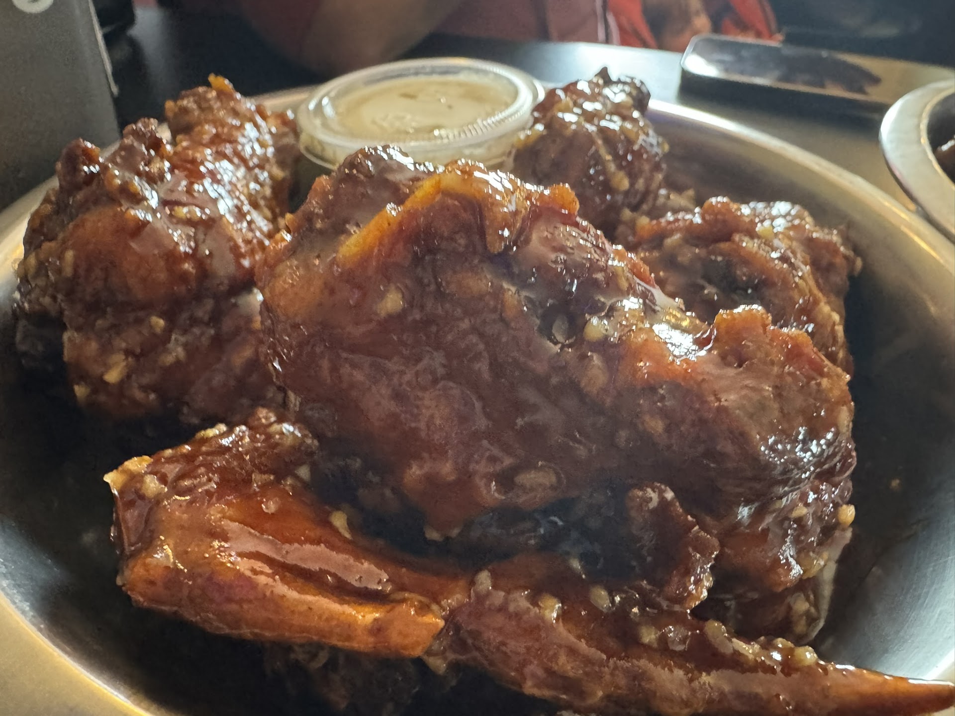 Got a chance to check out the Jug Handle with my buddies Eric and Aaron. I've heard many people have many different opinions of this spot so I knew I had to go and find out for myself. Got some Carolina Buffalo BBQ wings, some Tony Bruno wings, and a side of the Bald Eagle (their spiciest sauce) sauce on the side to dip into. Our server was very friendly and attentive. The dining room was pretty much just a basic bar/restaurant dining room but they do have outdoor seating during nice weather and a basement seating area as well.