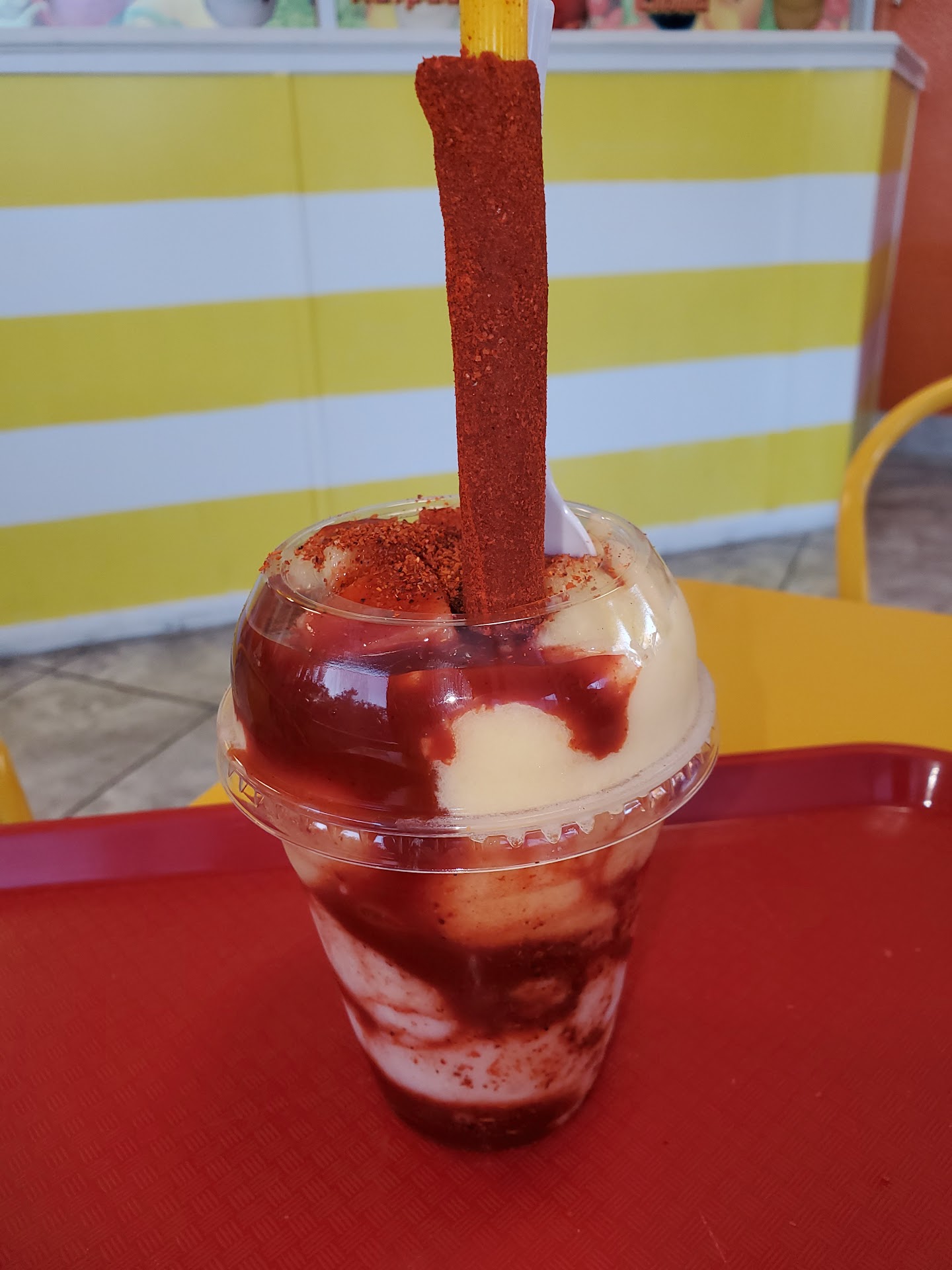 These are so good. The bottom is the fruit ice. Then they put fresada...pinada and this red tamarind..and I think chili powder.