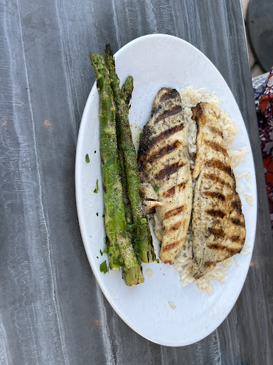 We went with the Sea Bass with my mom going for grilled with "fish seasoning" with white rice and grilled asparagus as her sides. I went for grilled "cajun" style with zucchini and Brussel sprouts as my sides. The asparagus and sprouts were both upgrades so we had to pay extra for them.