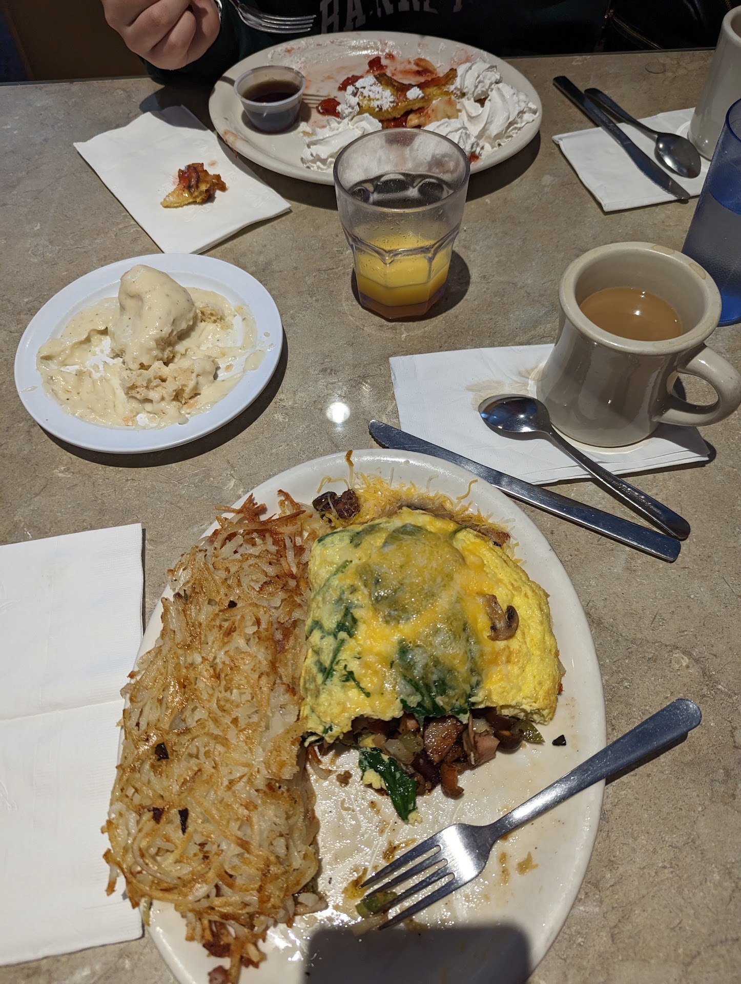 We have tried a few omelets Joyce's mushroom and the shrimp and spinach with hollandaise sauce on it. Both so good, they make them like I would at home. Big and full of stuff the way they should be. Always get the home potatoes with them. So good straight up or with cheese sprinkled on top. The battlefield Benedicts were great too. Got my soft cooked egg that let out that nice yolk ooze. Loaded with bacon, tomato and spinach with avocado on top and hollandaise sauce. The kids like thier pancakes, they cut through nice with out that stubborn pull like some places have. So that makes it easy too.