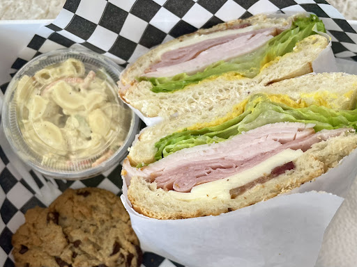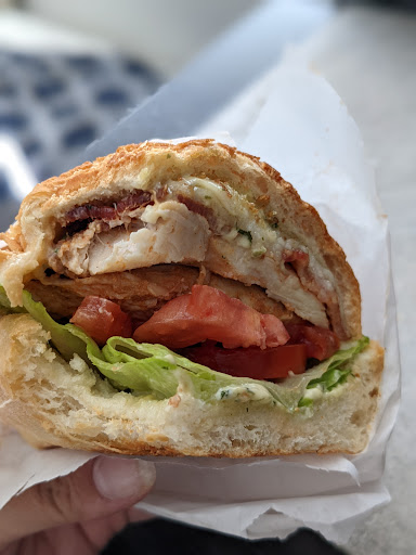 Sandwich details: Large, but not too large and well priced for what you get! Chicken was very moist. Mediterranean sauce was very very good. The toppings were carefully laid on the sandwich with perfect pairings throughout. The sandwich was so good, that I wanted another and I don't say that often. You also get a side salad or macaroni. I chose the mac salad, which also was great, not too much salt and had carrot bits in it, which was a good addition. On top of all this, they give you a homemade chocolate chip cookie. The sandwich was also nicely presented in a sandwich basket lined with inviting paper and the sandwich was carefully wrapped in paper then cut in half.