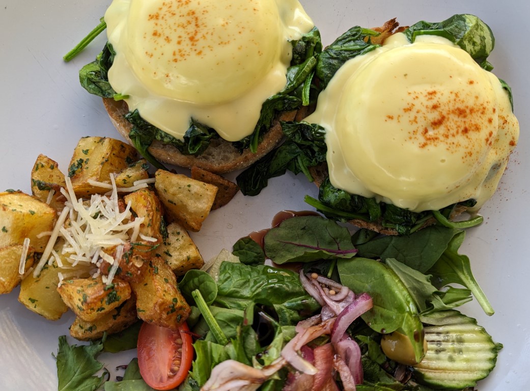 Florentine Benedict: It was almost too beautiful to disturb on its white plate. Fundamental to Benedicts are the eggs and these two were done perfectly. Steamed in hot water in a cup, the white of each egg was fully collected around the yoke and the egg was cooked just right. Beneath each egg was a small amount of spinach and then the muffin. The egg, spinach and muffin provided me with the taste of a Benedict perfectly prepared. On the plate was a mix of greens, tomato, a green olive with a light, oil-based dressing and also several cubes of nicely browned white potato.