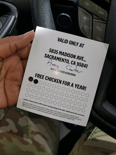 On 22 July 19 at approximately 230 pm, I went to the drive-thur to receive my weekly free meal that I had won a card for exactly one month prior, on 22 June 19. The "Free Chicken for a Year" coupon states that I can receive ANY $5 fill-up box of my choice and that a breast substitute will be extra. I placed my order for the 2 piece meal with green beans instead of mashed potatoes as a side, the female informed me that she could not substitute the mashed potatoes for me. I asked her why not and explained to her that the two previous times I had visited that location, the employees allowed me to switch my mashed potatoes out for green beans. The manager gets on the mic and tells me that he cannot switch the sides for free and if he did it, he would charge me $1 extra. I said no thank you and drove to the window. Once at the window I asked to speak with the manager. The manager came to the window with an attitude. I said sir do you know what this ticket says? I told him that it says I can have any fill-up box of choice with a side and any side comes with a fill-up, no extra charge for green beans instead of mashed potatoes is normally the policy. He took my ticket from me and told me "I will do it this one time, this is a free meal, I don't know why you're complaining". That was a rude statement coming from a manager. The first picture below is how my coupon looked when I gave it to him, the second picture is how he returned it to me. I said "Sir, absolutely not! This is wrong, I have only had that coupon for one month exactly(4 weeks) and when I gave it to you it only had 2 holes in it. A free meal is given per week and one hole is punched in the coupon per meal. I received the coupon on 22June19 with the first hole given that same day, I only visited 1 other time. When Dave, the manager, gave me my ticket back it was filled with extra holes. I asked him why did he do that to my ticket and he told me, "You missed all your meals". I said sir, Ive only had this coupon for one month exactly which is only 4 holes, you have put several holes in my ticket for weeks that hasn't even passed yet. Again its one hole per week. I told him that his behavior was unacceptable and that I will be reporting him. He says "You can report me, I don't care. I will not argue with you".