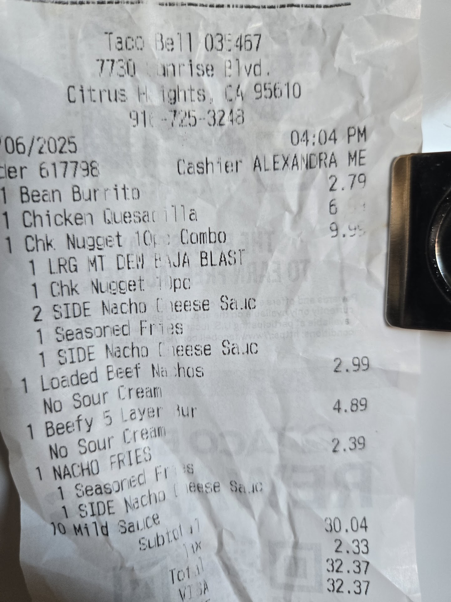 Read moreSent my son (has braces) and his buddy (both 14) to grab 6 chicken cantina tacos and 2 dorritos locos tacos. The business was dead (relevant) at the time they walked in, there is 1 car in drive thru and no one in the lobby. They were sitting there waiting for 30 minutes. I ended up going in myself and still waited another 10. They gave us crunchy cantina tacos , which have basically nothing on them. The boys were not asked which kind they wanted, or they would have said soft since my son can't eat the hard ones with his braces. I went in to try to get it fixed and had one girl being pushed into an office because she was acting like she was going to fight me. Making the excuse that "they also have a drive thru" when I pointed out the ridiculous wait time as they were empty. Unfortunately because we had waited so long a couple of tacos were eaten because, you know, hungry teenager. I took back the 4 remaining tacos and they remade the 4. Customer service is non exsistant. This location is terrible and the worst part is that...