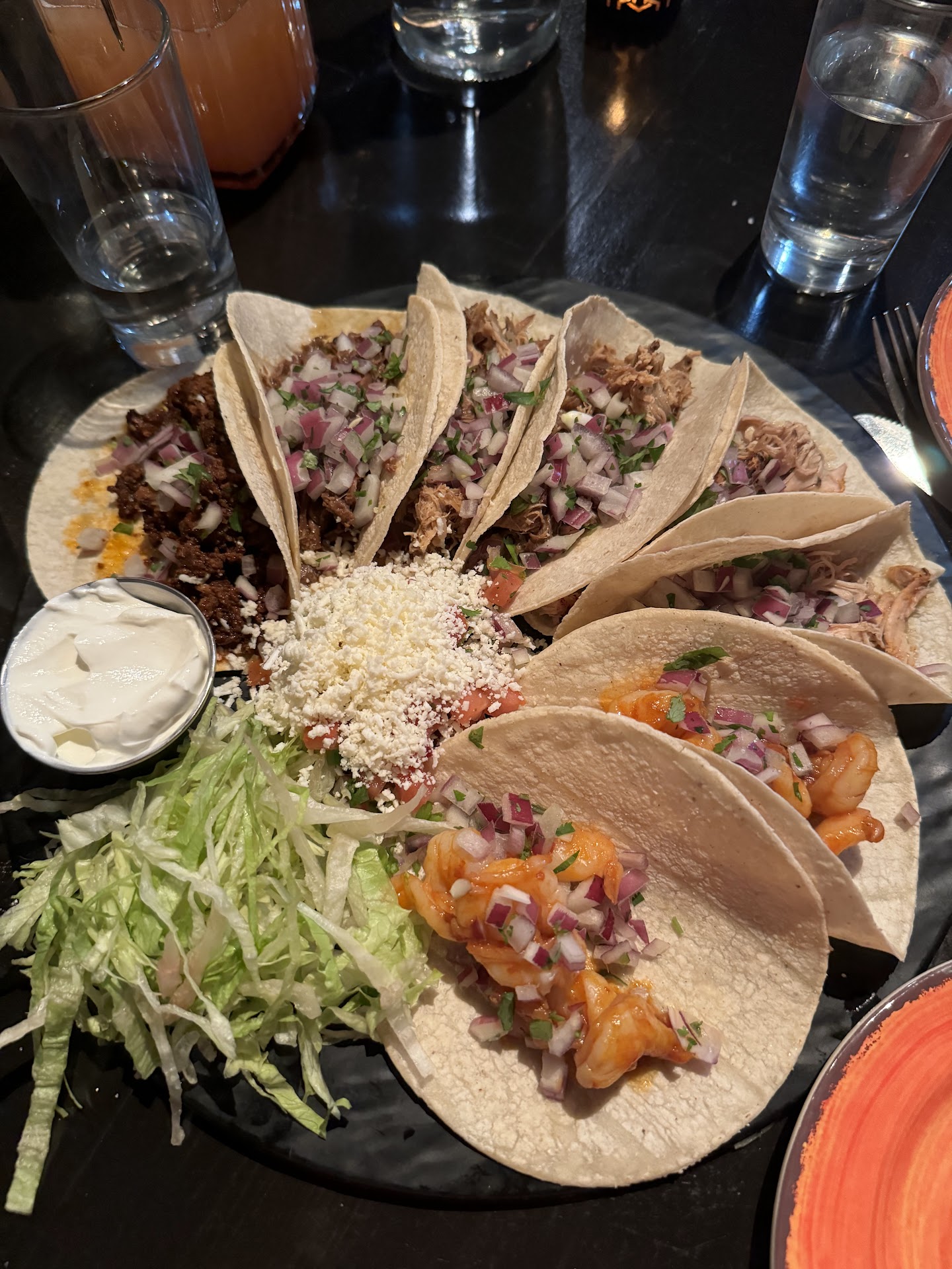 We shared 3 main courses. Very impressed with the taco party especially the duck and oyster variety. (who does that?). The duck was very moist and well seasoned and the oysters which were well prepared and not over fried. The Ceviche was an amazin assortment of fish marinated in a lite citrus. Excellent taste for a warm summer night. And Lastly, the Mojo steak Carnita. we had medium rare and the carmalized onion and pepper blended well with the seasonings. the Fixing were an assortment of lite cheese, peppers, radish and a coleslaw. The Carnita was flavorful, well prepared and lite. (it was very refreshing to go to a Mexican type establishment without the fatty refried beans, cheap nachos and overdone rice found in your typical establishment.)
