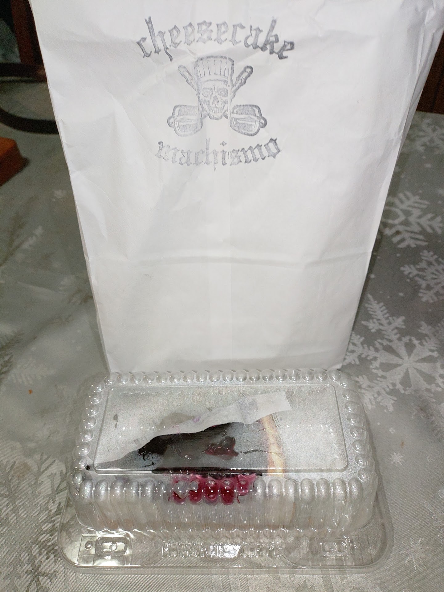 Received a cheesecake from my old man who had stopped in at Cheesecake Machismo, which had a very impressive selection of cakes to pick from. I imagine they must just have a cake base they start with, and then dress it up to match the flavor.