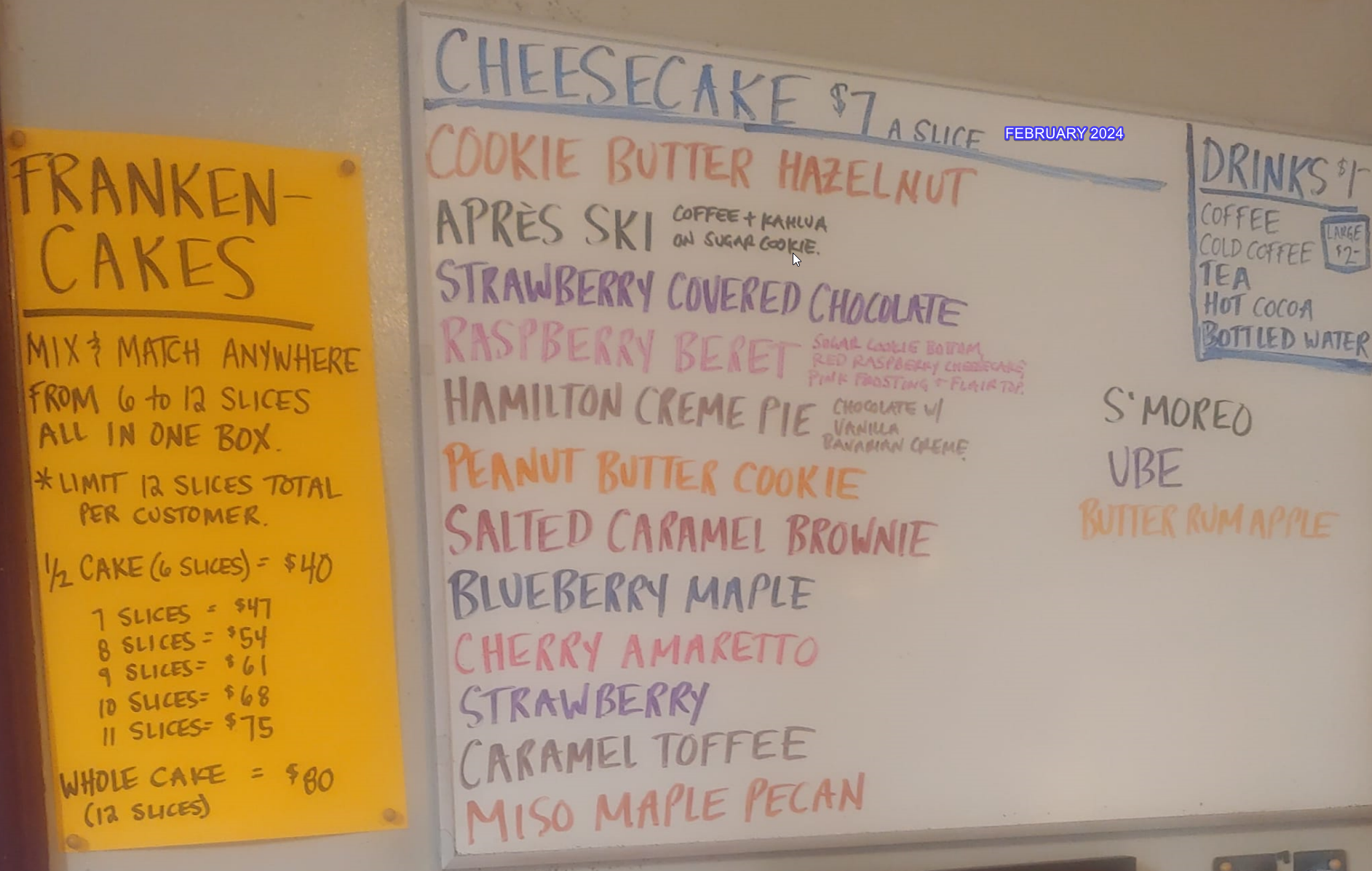Ā Ā Ā Read moreI can't put into words how amazing this place is! Even flavors that I wouldn't think I would care for I will try out and they are amazing. Any time I get a slice it takes me like an hour to eat it because with each bite I have to talk about how delicious it is. You also get a coffee with each cheesecake slice, somehow their coffee is equally as amazing as their cheesecake! I selfishly wish that they were open early in the morning just for coffee. The owners are always extremely nice and personable. The inside is cute and interesting, there is cool stuff all over the walls to look at while you wait for your slice of heaven or sit and enjoy your slice with coffee. I could go on for days about how great this place is! Always new flavors to enjoy! Will never get tired of it and is a major factor of why I could never imagine giving up...