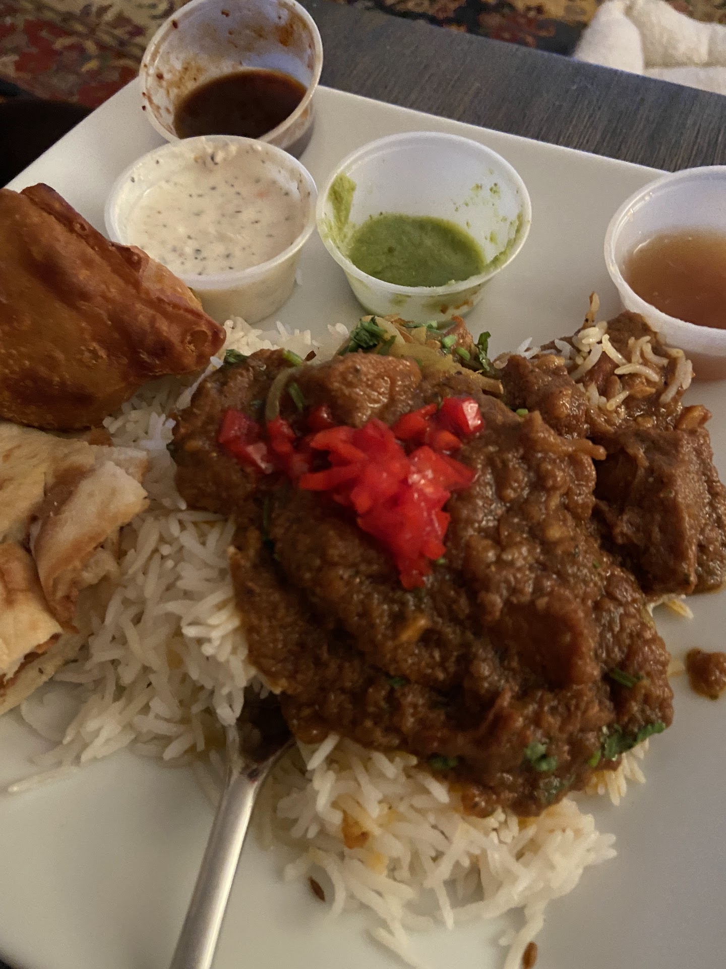 The picture is 1/2 portion of one of the rice orders, one of the two samosas, about 2/3 portion of Rogan Josh topped with the side of peppers, along with...