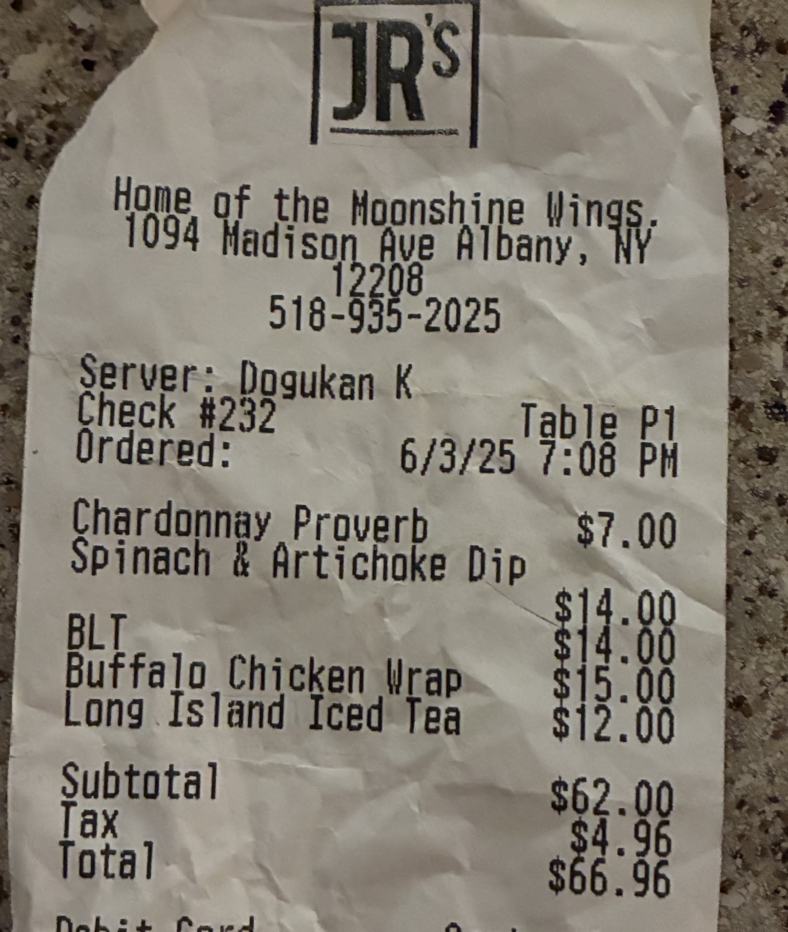 I’ll start with the positive - our waitress was very sweet. My moonshine wings were crispy like I had asked for. My sweet potato fries were good.