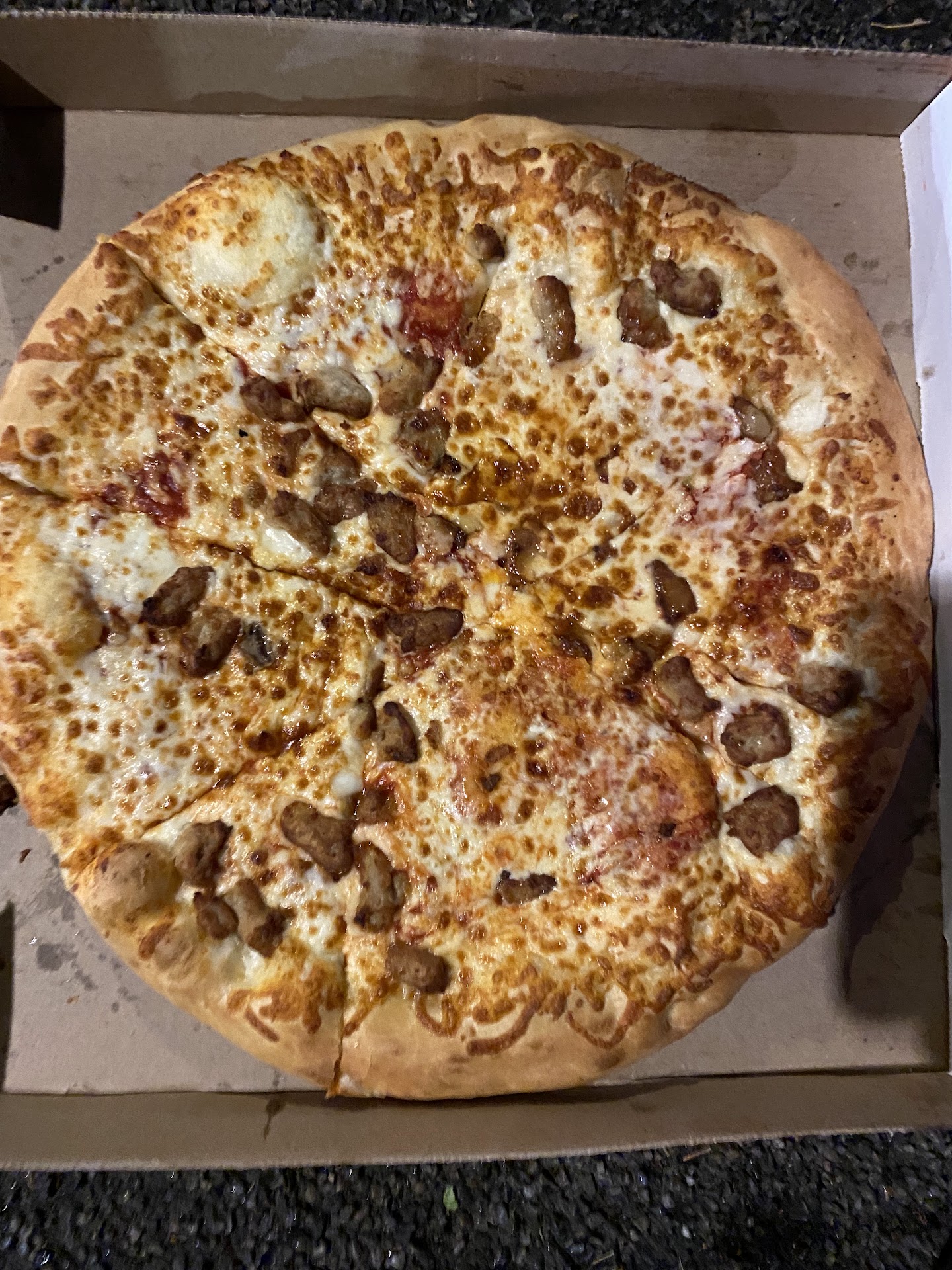 Extra Sauce, Italian Sausage. No sauce whatsoever, skimpy bits of sausage scattered in random places, some slices with literally ONE piece.